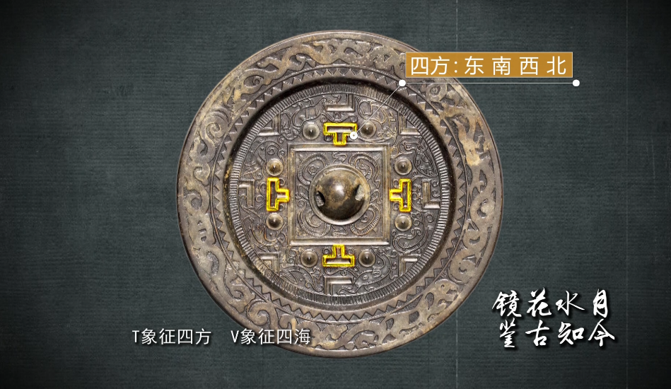 镜钮代表中国即茫茫宇宙的中心,钮座外的方格表示大地,圆形的镜子表示天,即天圆地方,方格四角外的乳钉,代表支撑天盖的柱子。T象征四方,V象征四海,L则象征保卫和守护。