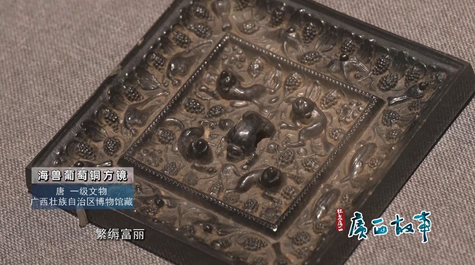 瑞兽葡萄纹镜是唐代的爆款镜,广西多地均有出土。这件四瑞兽葡萄纹铜方镜铸造精致,繁缛富丽,内区高浮雕四只瑞兽作重列式四角形配置,兽间布以葡萄串及枝蔓,外区禽鸟、鸳鸯环绕,意趣横生。