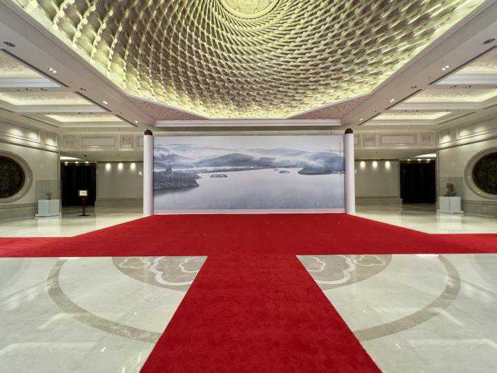 杭州亚运会开幕当天,国家主席习近平和夫人彭丽媛在西子宾馆举行宴会,欢迎来华出席杭州第19届亚洲运动会开幕式的国际贵宾。这幅名为《水光潋滟晴方好》的数字版画成为合影背景,并在新闻联播里出现。