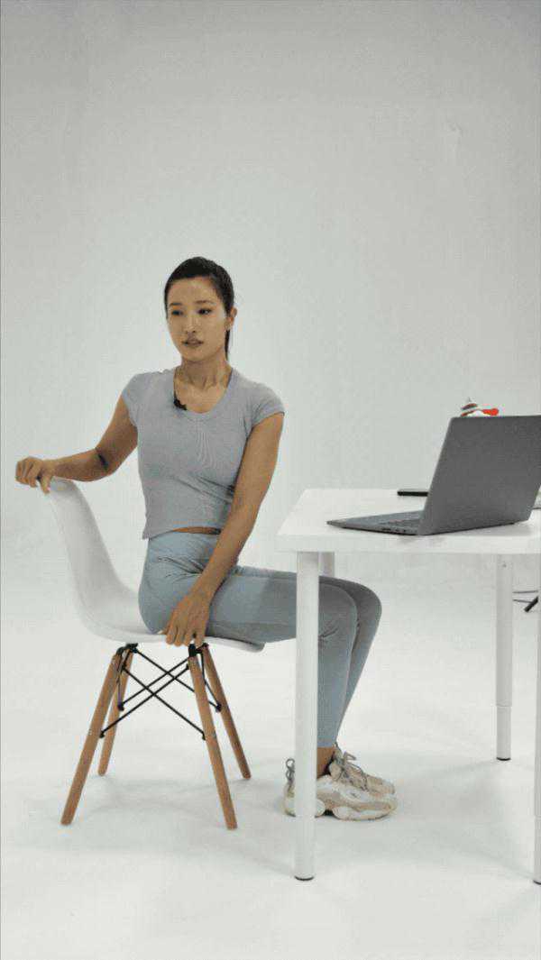 手放在椅子侧面,旋转身躯。每一组动作停留20秒换边,做2-3组。
