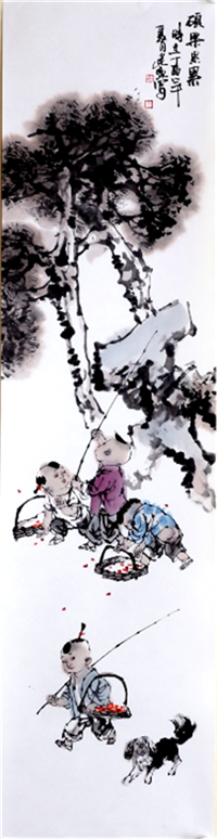 姚建广先生主攻人物画创作,兼攻花鸟和山水,是一位专业技能和素养比较全面的画家。其人物画,有古典人物画和现代人物画,其中尤以儿童画(婴戏图)、钟馗系列、老子系列和少数民族系列得到业界认可。“婴戏图”是以儿童玩乐情景为题材的中国绘画类型,历代不少名家都画过此类作品,如南宋苏汉臣的《秋庭戏婴图》便是此中珍品。多子象征着多福,这也预意着中华民族对幸福家庭生活的一种向往。姚建广先生曾绘制过一幅《百子图》,场面宏大、101个孩童,多而不乱,充分体现了他的艺术水平。