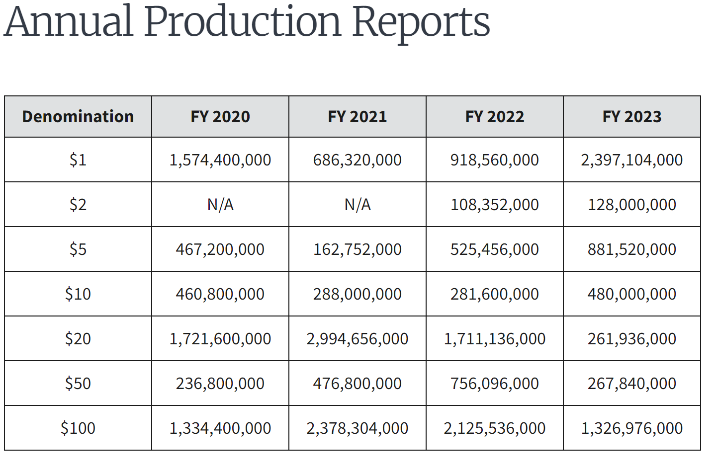 一是印钞数量下降。根据美国雕刻与印刷局公布的年度生产报告,2023年美元的生产数量为57.58亿张,比2022年下降了11%,比2021年下降了18%。