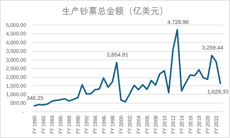 二是印钞金额下降。2023年美元的印钞总面额为1629.33亿美元,比2022年下降了44%,比2021年下降了50%。