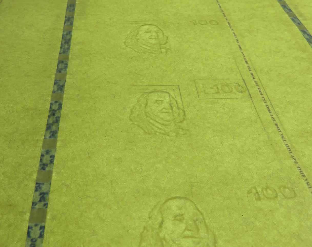 美元钞票纸张由25%亚麻和75%棉花制成,并随机分布着红色和蓝色纤维,以增加仿制的难度。这种纸张由马萨诸塞州达尔顿的CraneCurrency公司专为雕刻与印刷局制造,除BEP外,任何人都不得持有这种纸张。5美元及以上面额的钞票纸张都印有特定的水印和安全线。