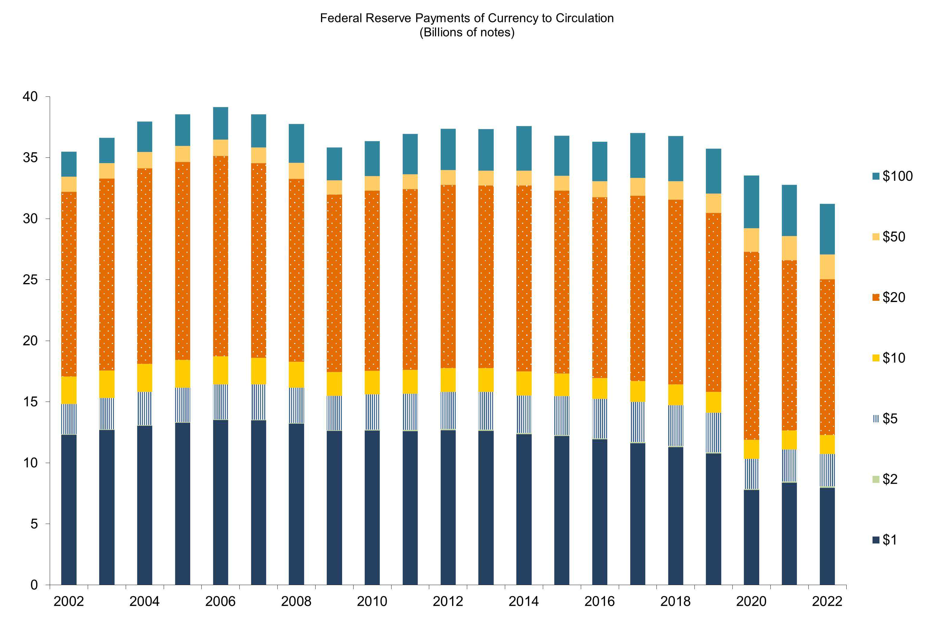 从近年来现金的投放量看,美元钞票处于净投放状态。以2022年为例,投入流通的现金投放金额是8073亿美元,回收流通中现金金额为7335亿美元,净投放718亿美元。