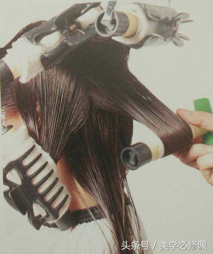 中长发酷感时尚“梨花头”陶瓷烫发技术操作图解过程:易打理,最重要的是卷度保持时间要长,烫发过程中使用中号杠具卷到发根。