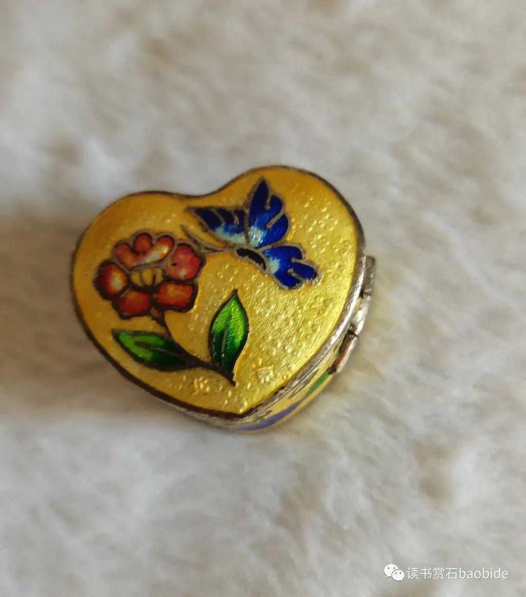 小巧可爱,盒面掐丝花蝶图案,黄底,蓝蝶,红花,绿叶,颜色和谐,图案朴拙,盒面下方还錾刻“北京”二字,油然生出一份亲近感,也知晓了此件当为上世纪八十年代出口创汇时期的产品。小小一个盒子,各色手工工艺一丝不苟,使得它即使经历了岁月的磨砺,呈现于眼前的,依旧灿然。
