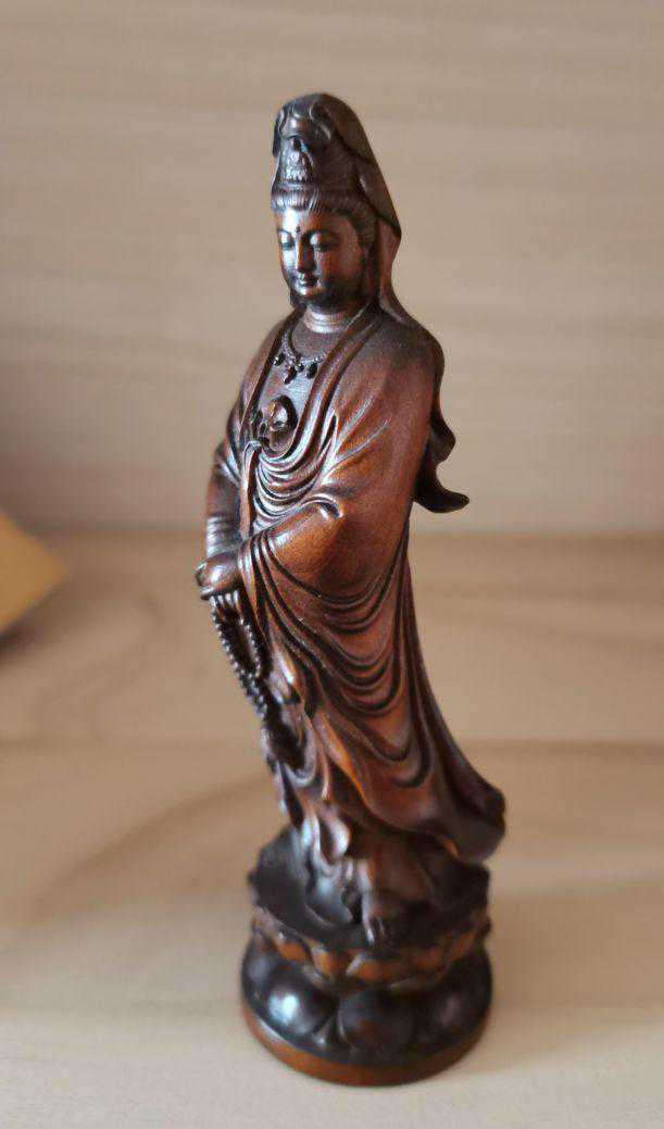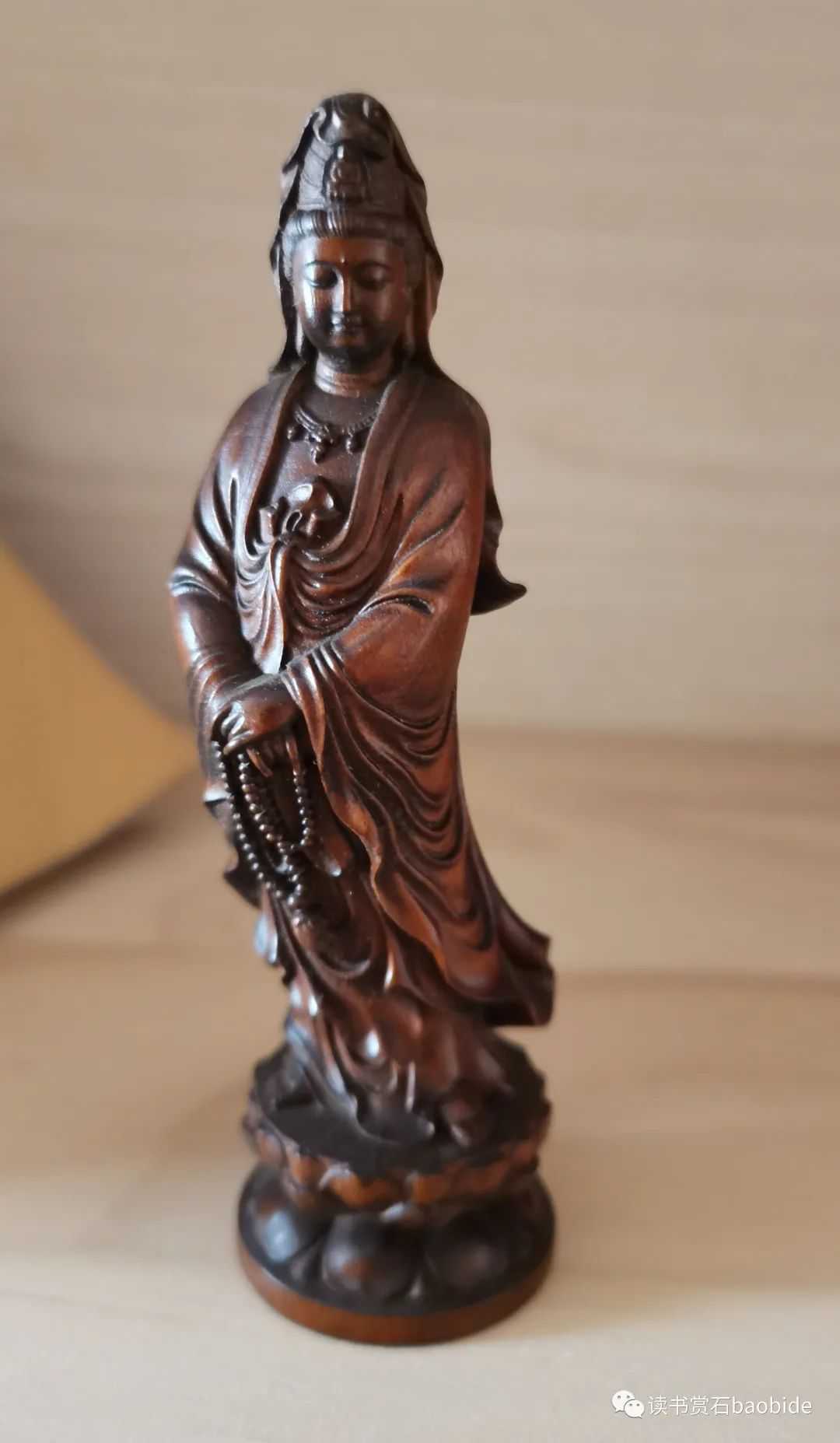 有关观音的各种材质的塑像实在是太多了,作为一个无神论者,以往看到都是一略而过,而这座观音像却莫名吸引了我,她身形玲珑,端庄雍容,双目下垂,微露笑意,有一种亲切的气质,似乎不再是神,而是一位慈爱的母亲。正是这种亲近感使我将她请了来,放于书架之上,莫名觉得心里安定了些。