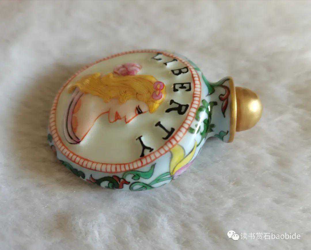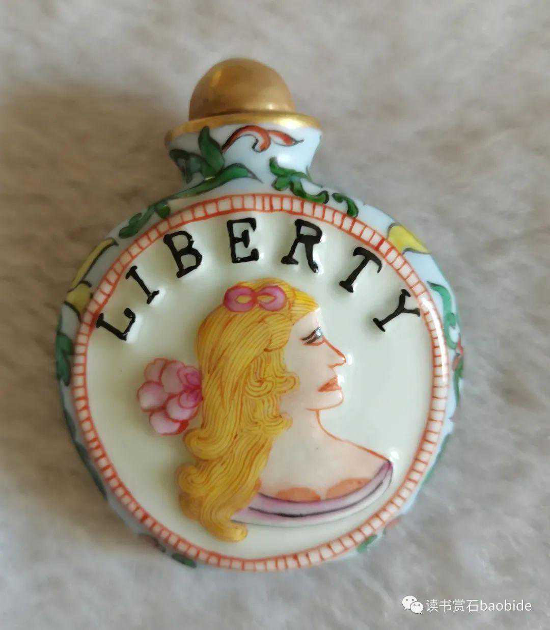 鼻烟壶一面绘钟面,一面绘一金发的外国摩登女子侧像,头像上方黑体英文“LIBERTY”(自由),画工说不上精细,但所绘内容是迄今为止我所仅见的;另一特别之处是壶体,从上到下厚度逐渐收缩,比较少见。壶底书“乾隆年制”,应该不是本朝,但也不会是新的,至少也是民国仿。