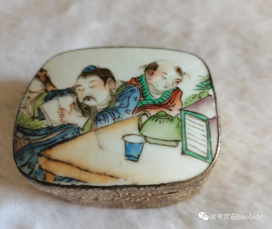 老瓷片为盖,盒身为银制。主要是瓷片的内容吸引了我的注意:一中年男子手捧一册书,眼神专注,嘴角微露笑意,似是被书中内容所吸引。男子左侧坐一肥头大耳的书童,右侧一面部不详的女子,桌上有书箱,茶壶和茶杯。既有书香气又有烟火气。以阅读为题材且这么完整的瓷片我也是首次碰到,原本中年油腻的大叔,因为读书而多了几分可爱。至于瓷片的新老,似乎并不重要了。