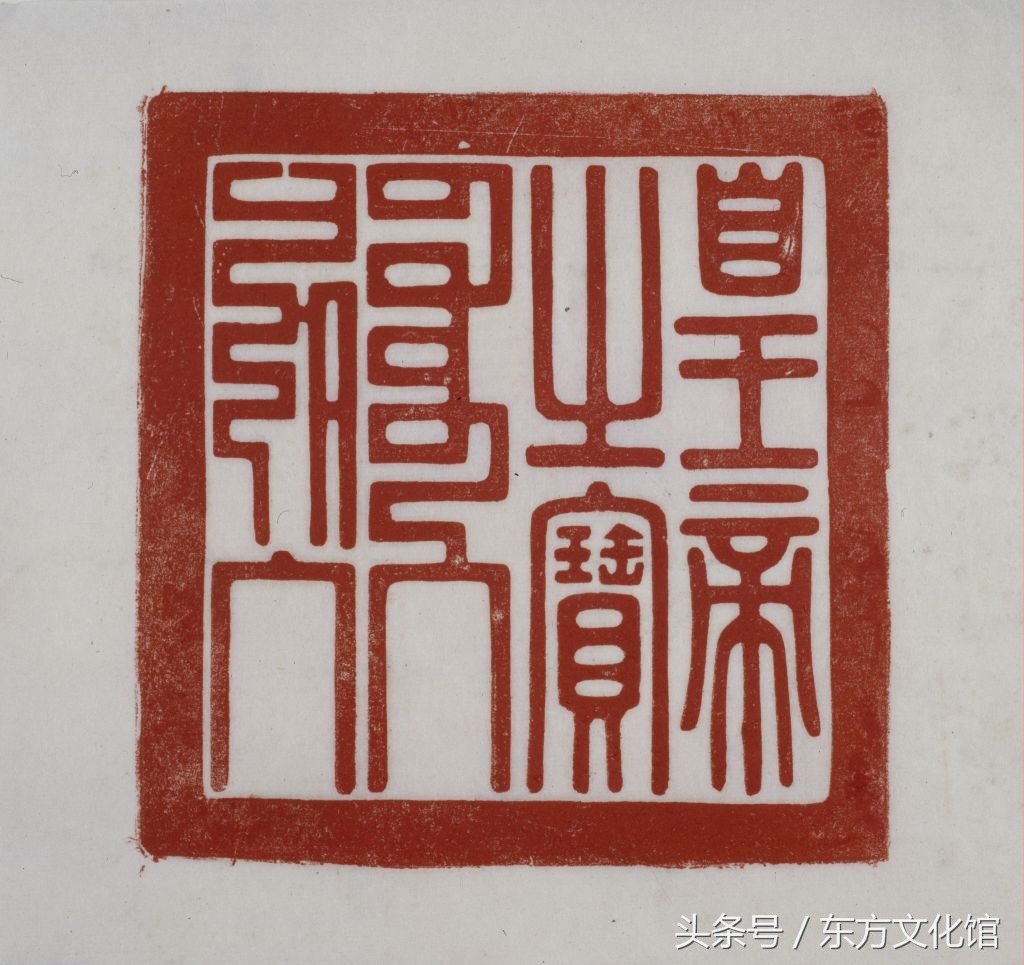 同治帝宝玺。此宝用一块水晶雕制,尤其是桥纽及连环,雕刻难度很大,不易成型,故十分难得。此宝曾钤于慈安皇太后、慈禧太后《行乐图》以及咸丰帝定陵神道碑之上。