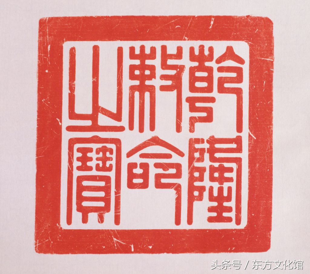 三希堂,在紫禁城内养心殿西暖阁,因这里藏有稀世之珍的王羲之《快雪时晴帖》、王献之《中秋帖》、王珣《伯远帖》而得名。从艺术鉴赏角度看,“三希堂”便成为著名艺术品的典藏地而闻名于世,与之相对应的“三希堂精鉴玺”和“宜子孙”玺便当然成为鉴定性标志。二玺主要钤盖于《石渠宝笈》、《秘殿珠林》初、续编著录过的书画作品之上,具体使用情况在《石渠宝笈》、《秘殿珠林》初、续编的“凡例”中有明确说明。如《石渠宝笈》初编,凡书画分贮乾清宫、养心殿、重华宫、御书房四处,俱各用鉴藏玺以别之,又“石渠宝笈”、“乾隆御览之宝”二玺,册、卷、轴皆同。上等者则盖以“乾隆鉴赏”、“三希堂精鉴玺”、“宜子孙”三玺。而《石渠宝笈》、《秘殿珠林》续编入选者,则钤用“乾隆御览之宝”、“乾隆鉴赏”、“三希堂精鉴玺”、“宜子孙”、“秘殿珠林”或“石渠宝笈”、“秘殿新编”或“珠林重定”、“石渠宝鉴”或“宝笈重编”。而这两方玺在钤盖时的位置也基本固定,一般都在作品的右下方,且“三希堂精鉴玺”在上,“宜子孙”玺在下。