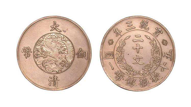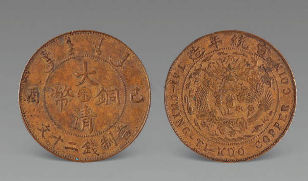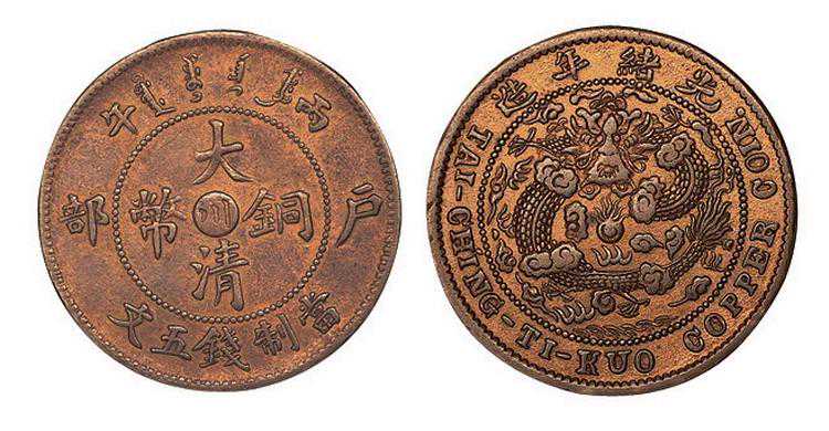 大清铜币,各地铸造比较统一。铸造于1900年(清光绪二十六年)到1911年(宣统三年),流通时间较短。因其版面设计优雅,雕刻精良,且存世量极为稀少,大清铜币光绪年户部造当十被誉为中国近代制币中的十大名誉品之一。