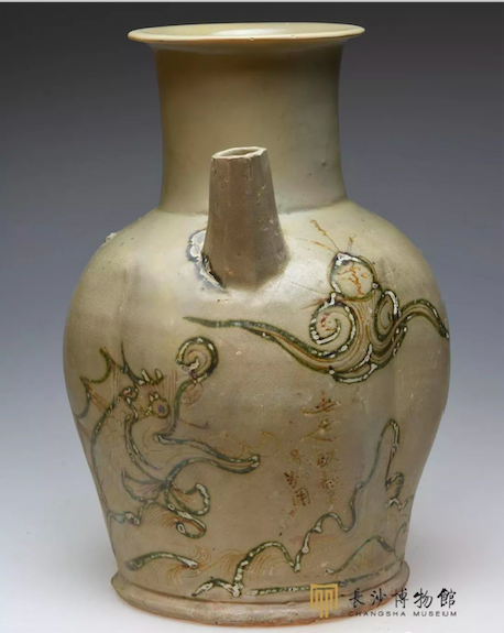 唐长沙窑“此是饮瓶不得别用”褐绿彩摩竭云纹瓷壶