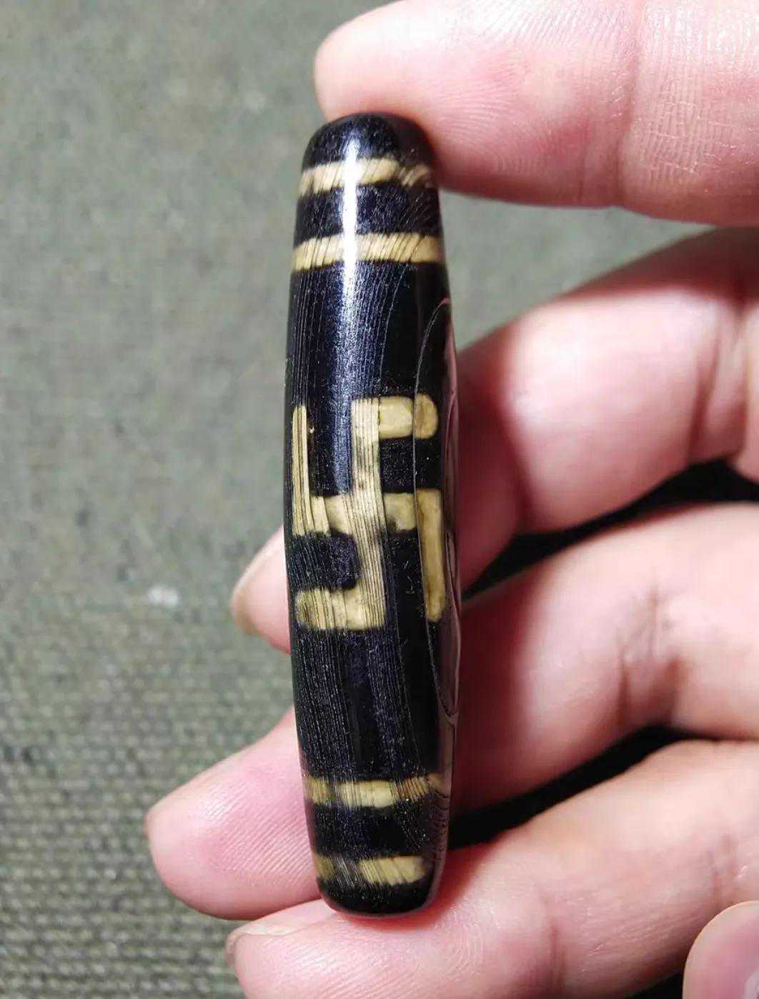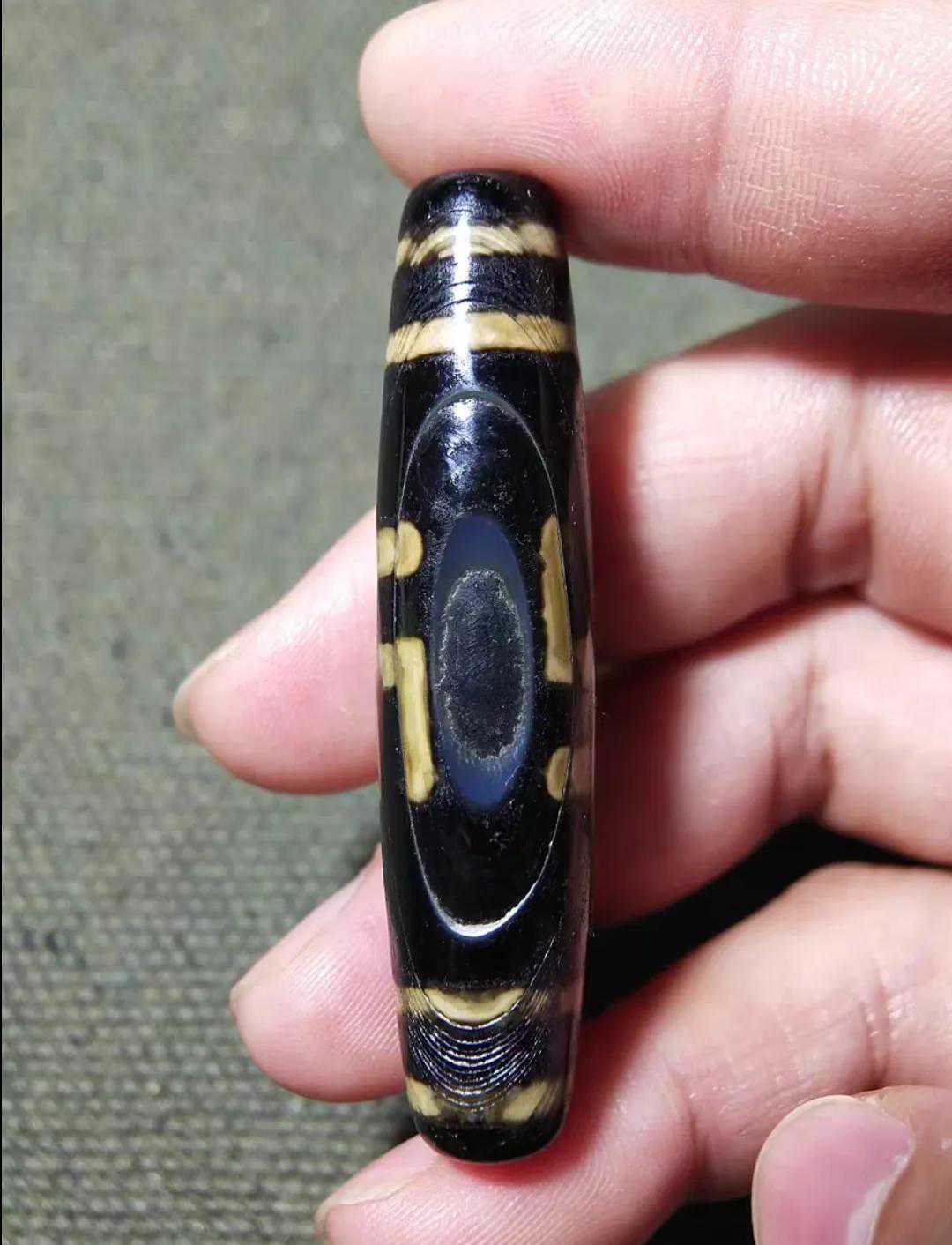 大约寓意圆融无碍通达阴阳万界。形成现在这种图案纯属巧合绝非古人人为,因为古人制珠一般先做成通体不透光,在后期制作图腾符号时根本看不到只有经历数千年自然解理后才会出现的无数椭圆纹理。底色和图腾只有单调的黑白两色。图腾部分的黄色即是备受追捧的牙黄。碧色佛眼部分看似透明,打灯后发现也是同珠体其他部分一样完全不透光。