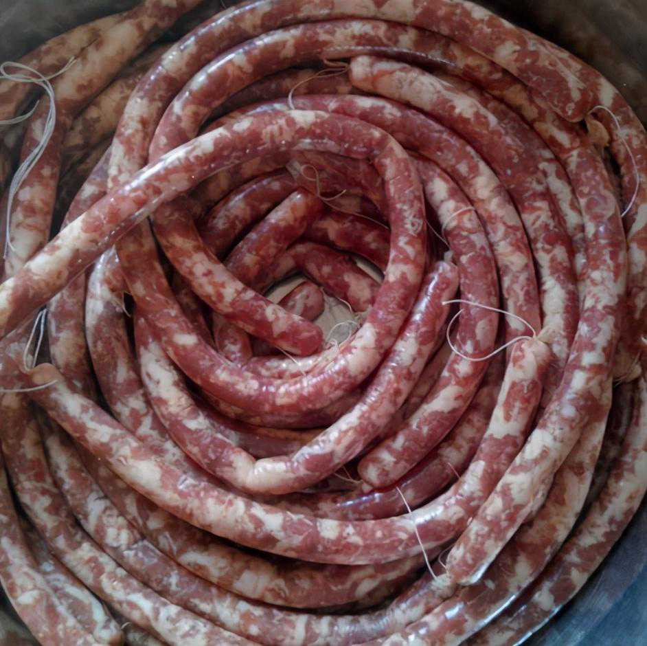 5.把每个肠衣的一端先用细绳打结系上,有灌装机器的可以直接用机器来灌装,把肠衣的另外一头套在机器上,灌装好之后再把肠衣的另外一头打结,整个香肠的中间分成几段打结系绳。全部灌装后把香肠放在盆中腌制一晚,如果里面有小气泡需要用牙签把肠衣扎一个小孔,第二天可以直接把香肠挂在外面晾晒风干,一定要保持通风,天气好的情况下晾晒10天左右差不多就可以了。吃的时候也非常方便,蒸熟切片,调一个蘸碟就可以吃了。以上就是小编今天要跟大家分享的关于灌香肠的方法,几十年的秘制配方,一次做10斤,鲜香入味有嚼劲。喜欢的朋友赶快试试吧!