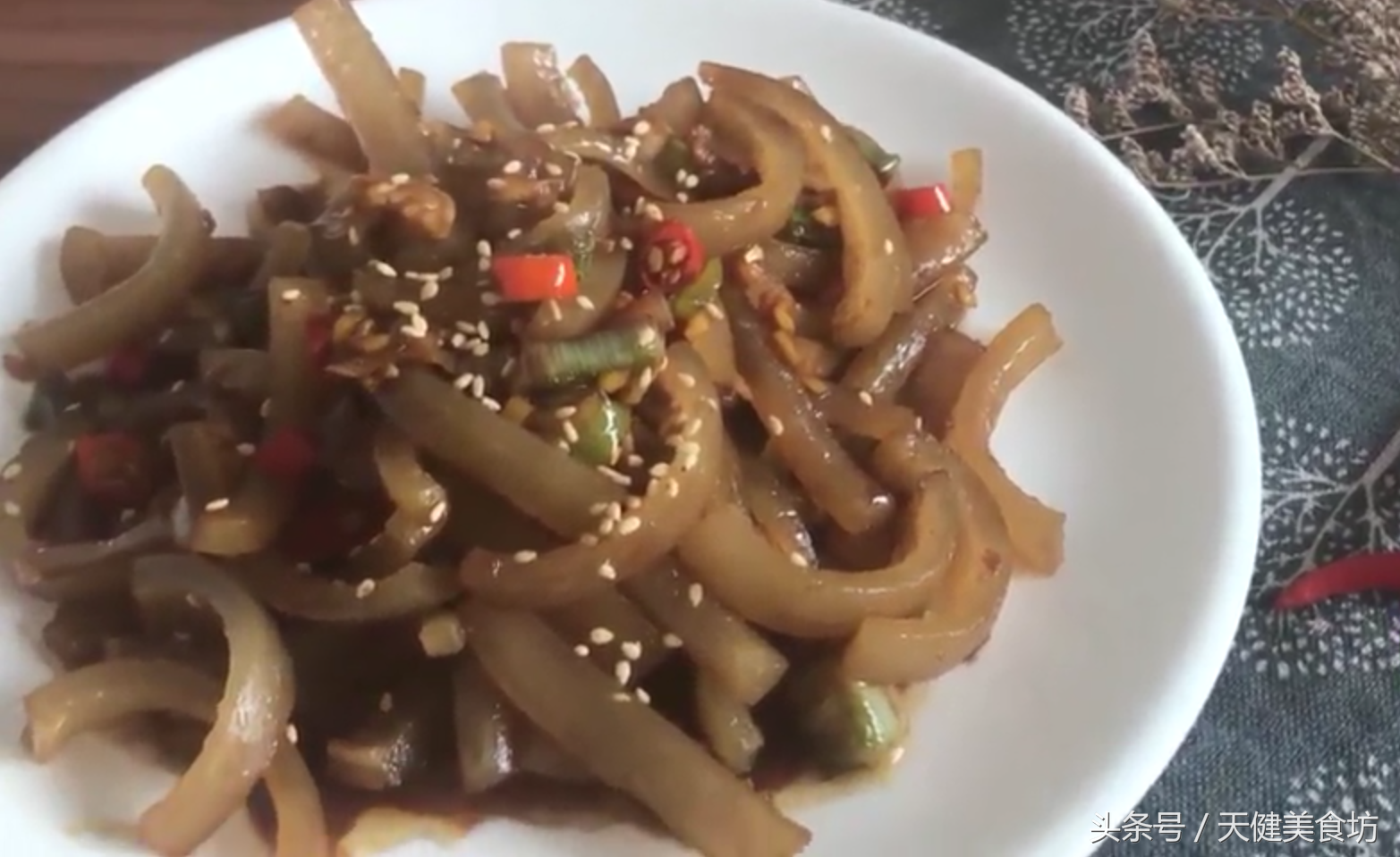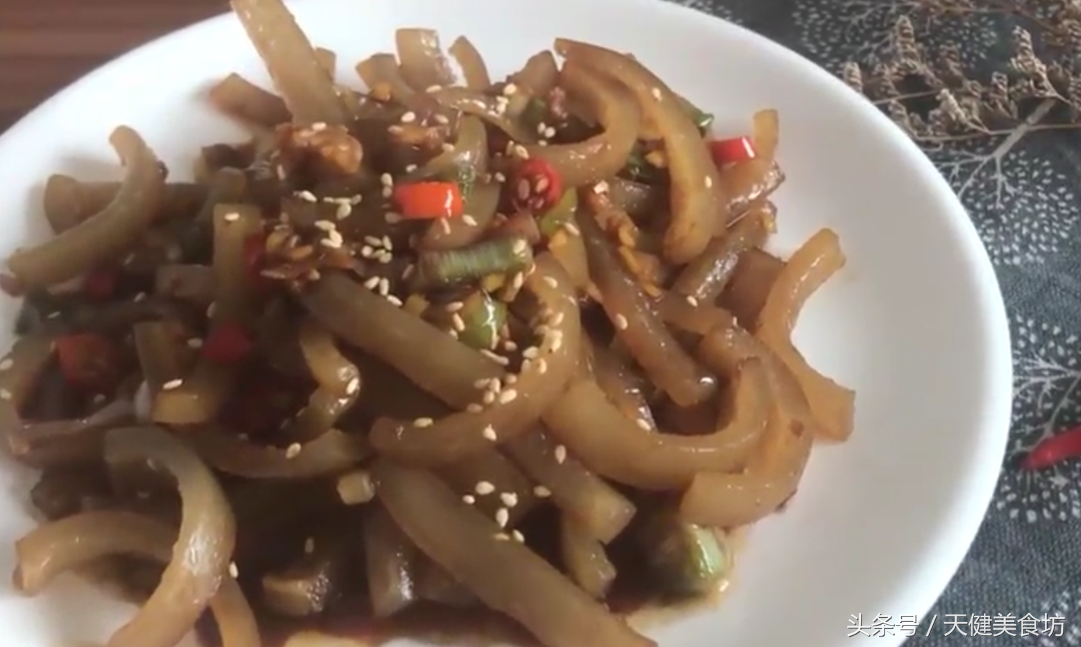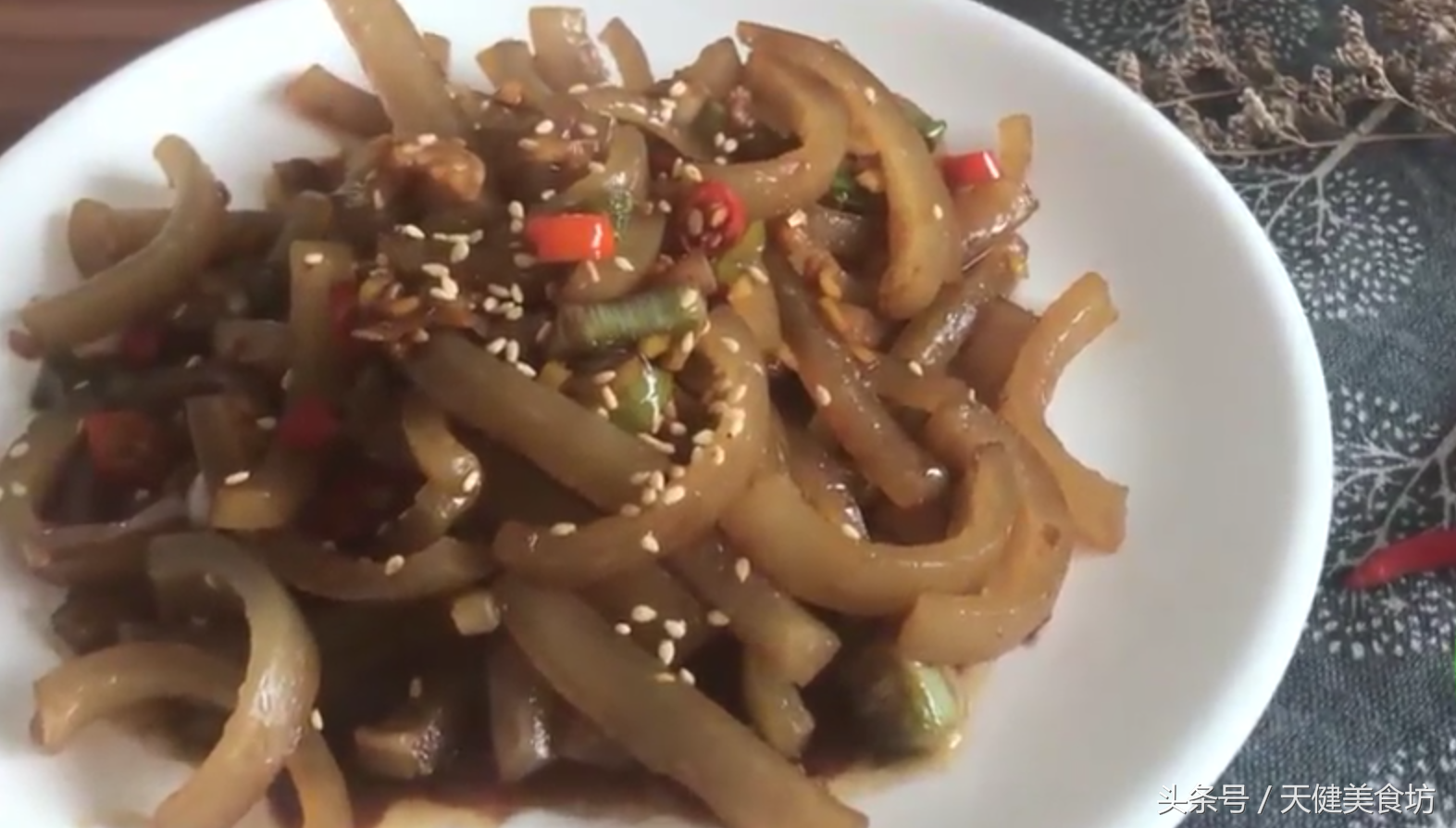 1分钟后,加入1茶匙的白芝麻,然后用锅铲翻炒均匀,即可出锅!这样一道美味可口,好吃下饭而又含有丰富胶原蛋白的香辣炒猪皮就做好了,味道超赞!喜欢的小伙伴们就赶紧做来试试看吧!