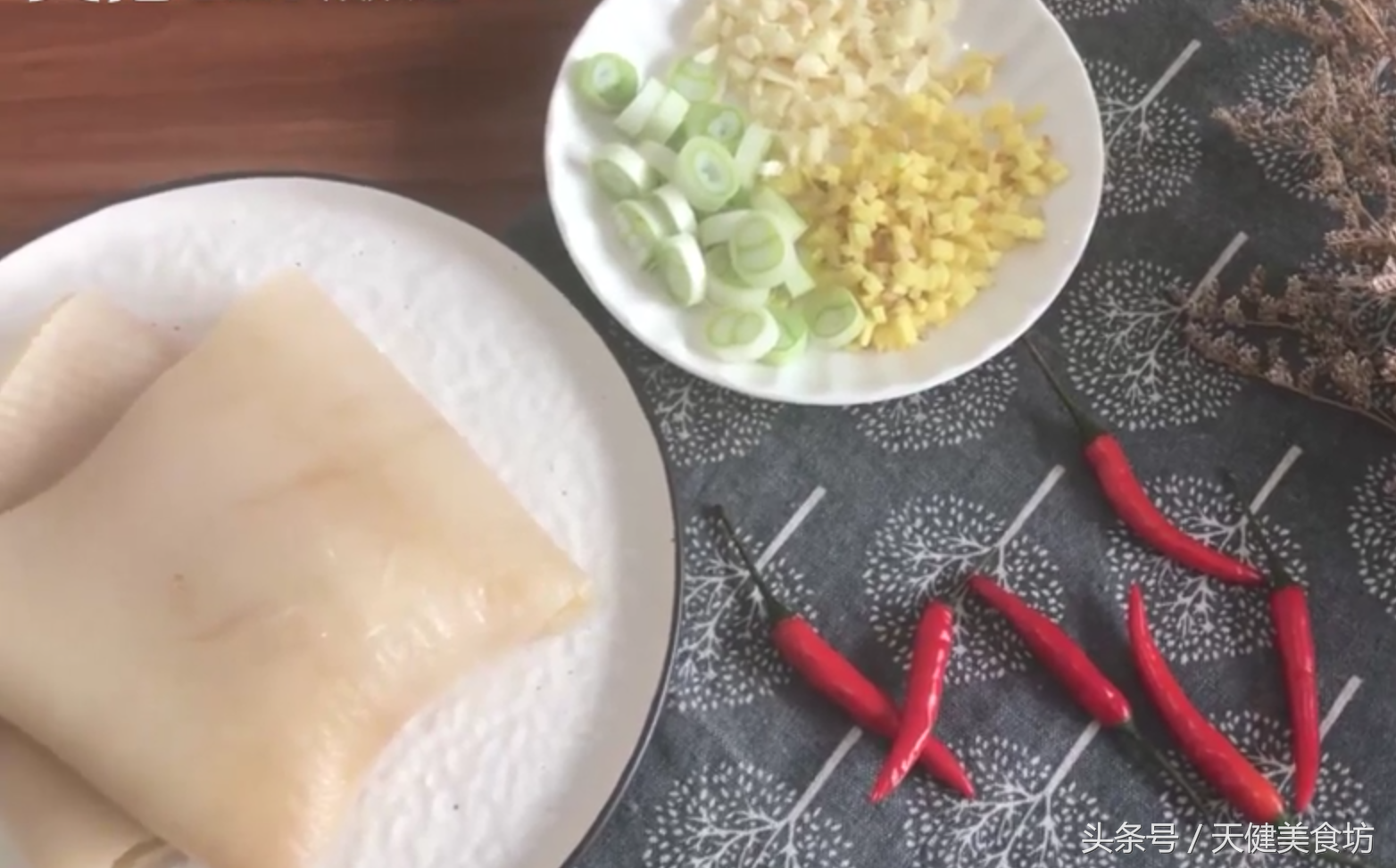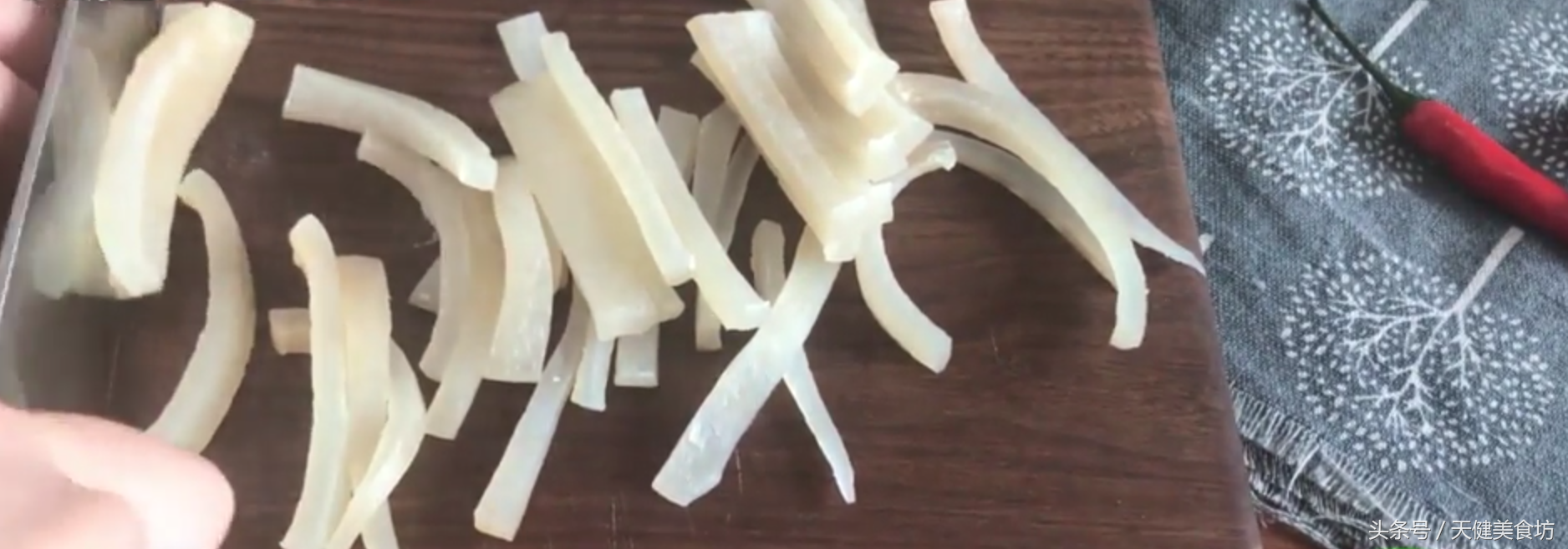 猪皮表面处理干净后,起锅加水,把猪皮也冷水下锅,加入1汤匙的料酒去腥,还可以加入几片姜片,然后大火煮沸,水煮沸之后,如果有浮沫,用汤勺撇去浮沫!再煮1分钟后即可捞出沥干水分!稍微放凉后,把猪皮切成小细条!再顺手,把小米椒切碎,蒜剁末,剁末,葱切碎。