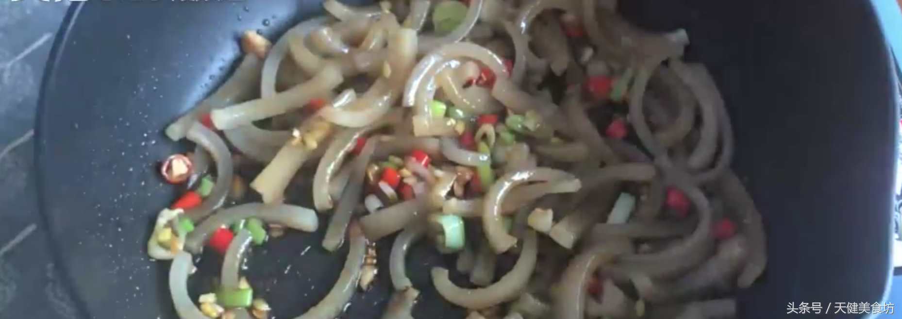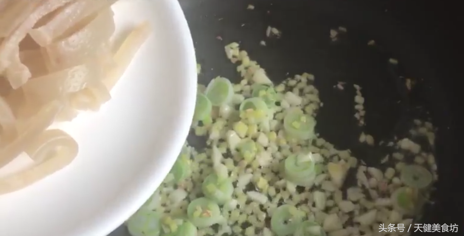 接下来起锅加油烧热,油温5成热左右,把姜末,蒜末,葱碎,倒入锅中,小火炒出香味,香味出来后,把切成细条的猪皮倒入锅中,然后转成大火翻炒,把葱姜蒜的香味炒入猪皮当中。