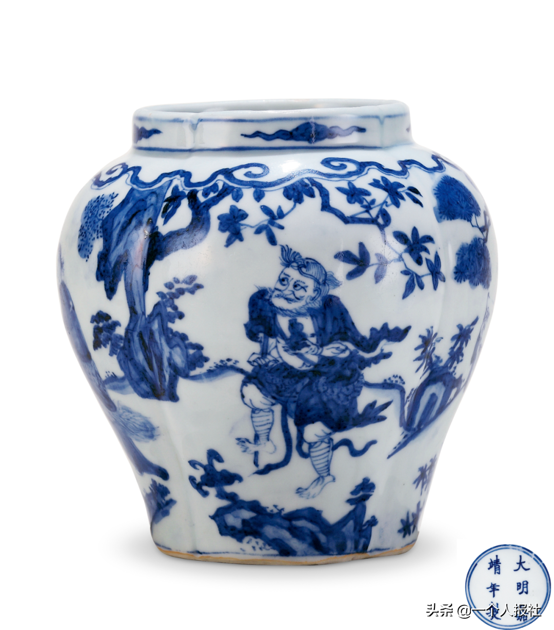 明嘉靖青花四仙花口罐