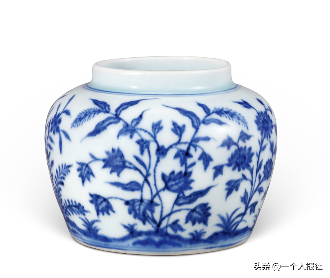 此形制的扁罐源自明初,承袭永乐翠青釉、白釉器之形,成化时期见青花、斗彩等品种,装饰纹样有莲塘水藻纹、牡丹飞蝶、九秋花草、缠枝莲花纹等。此罐所绘花草颇具自然意趣,似亦承自永乐时期,如土耳其托布卡比博物馆藏一永乐青花大盘,绘相似风格纹样,见《海外遗珍陶瓷》,1991年,页131。据考,成化后期所制多为斗彩天字罐。此种青花罐或主要出现于成化中前期。相似纹样也见于成化时期其他器类,如景德镇御窑厂成化晚期堆积层出土的一未完工的斗彩盒,以及北京故宫博物院藏斗彩盒的盒盖,见《成窑遗珍——景德镇珠山出土成化官窑》,香港,1993年,页84、182-183。