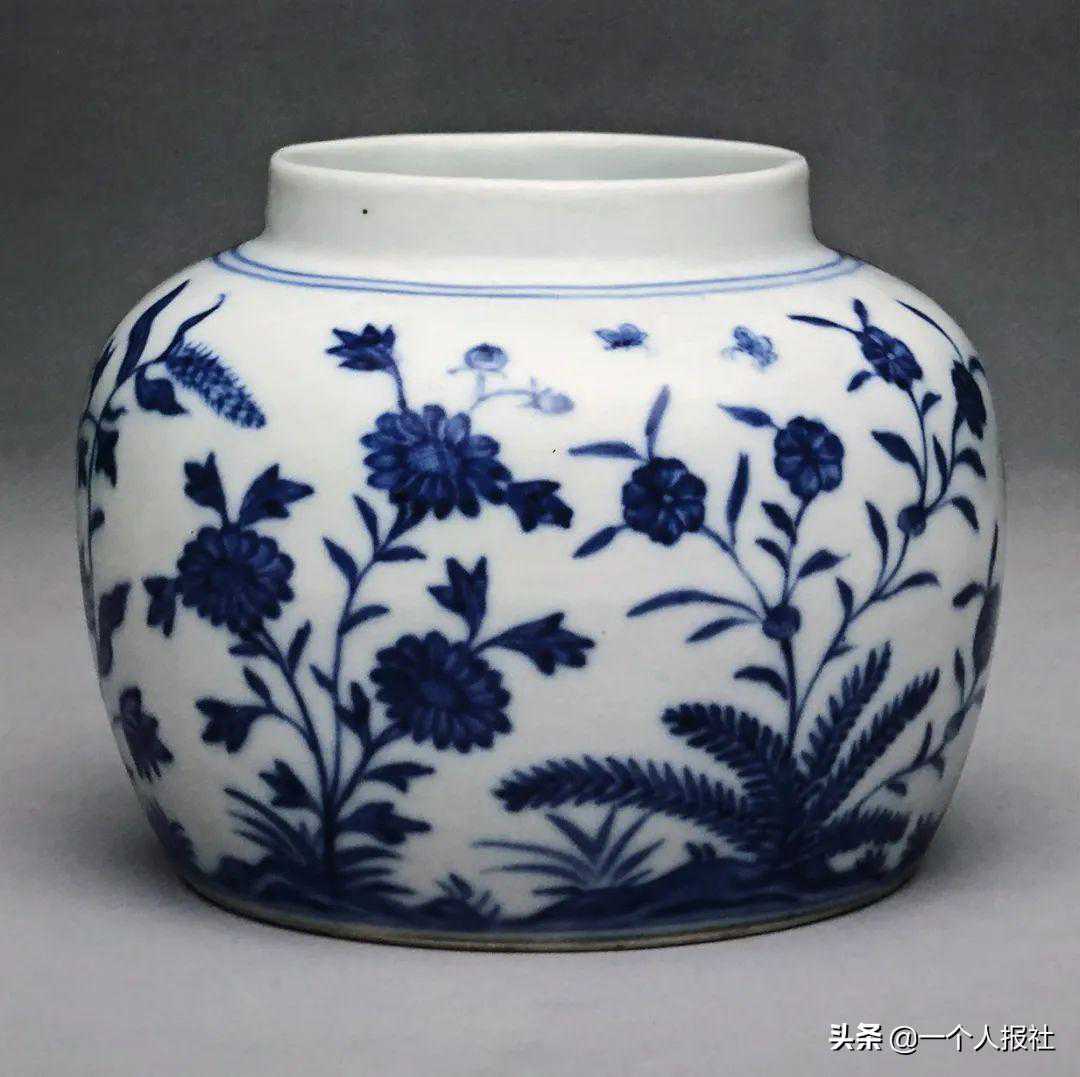 本品直口,短颈,丰肩,扁圆腹,圈足。器以青花绘菊花、石竹等盛开的花卉,间绘蝴蝶翩跹翻飞,摇曵飘香,为成化时期御窑瓷器。《博物要览》评价有:「成窑上品,五彩供养浅盏,草虫浅盏。青花纸薄酒盏,五彩齐箸小碟香盒……各制小罐,皆精美可人」。本品造型饱满,胎质细腻,釉质温润肥腴,画意生动,绘制纤柔精细,疏朗明快,为成化青花器中的精品,展现出陶工高超的技艺和艺术修养。