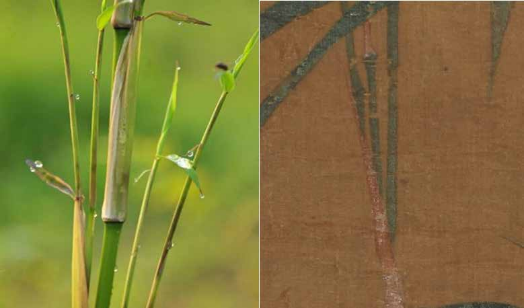 宋徽宗《写生珍禽图》(左)与《晴竹图》竹叶比对