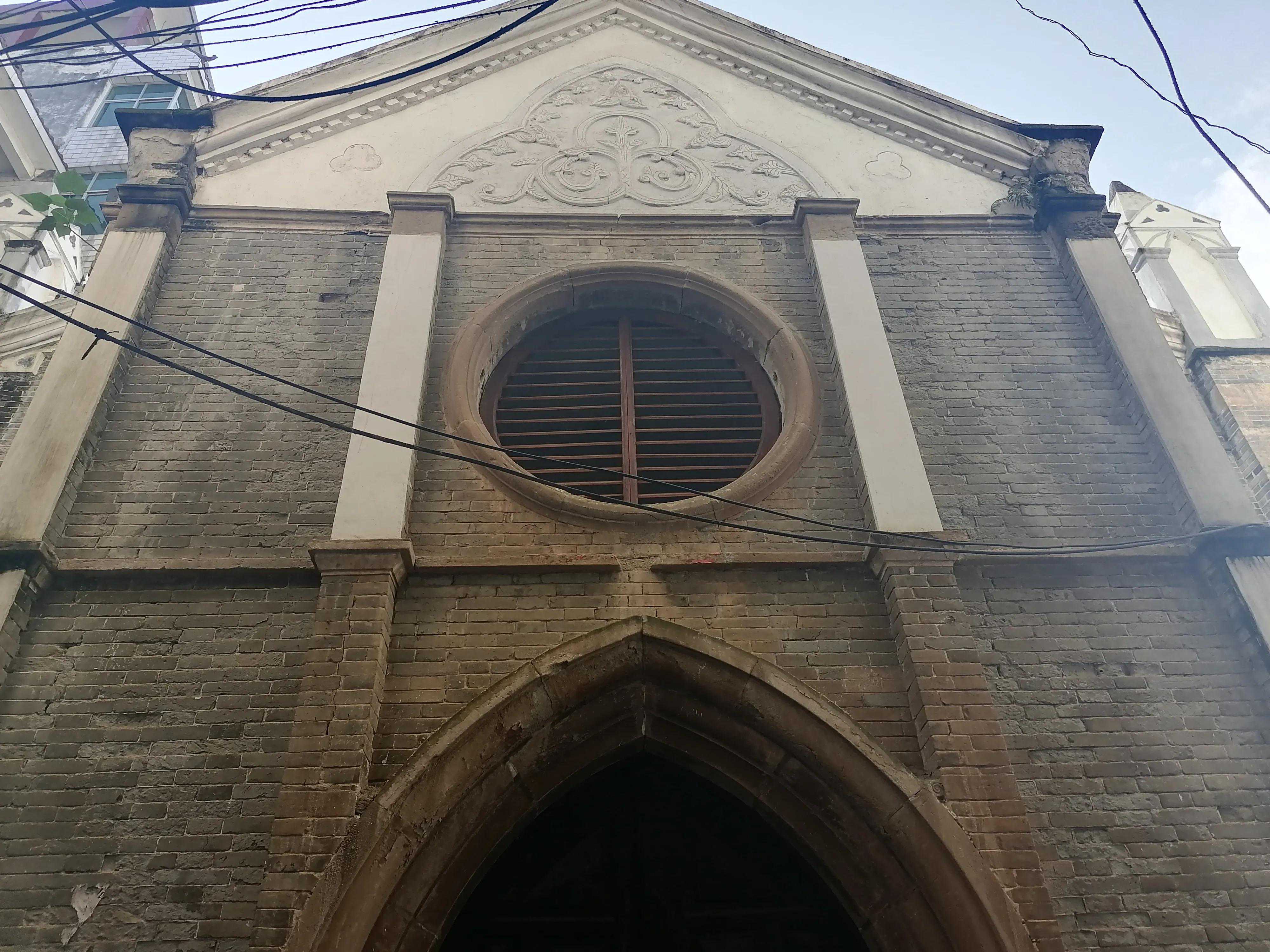 这是胜利路,在这条街上,有两座古迹,一座是七星伴月(县城内有七口铁井头(群众这么叫的),与文庙内的泮池相配,称七星伴月为城内一景)之一的铁井头,被埋于地下。一座是天主教堂,为泰和县人民政府旧址,藏于屋后。