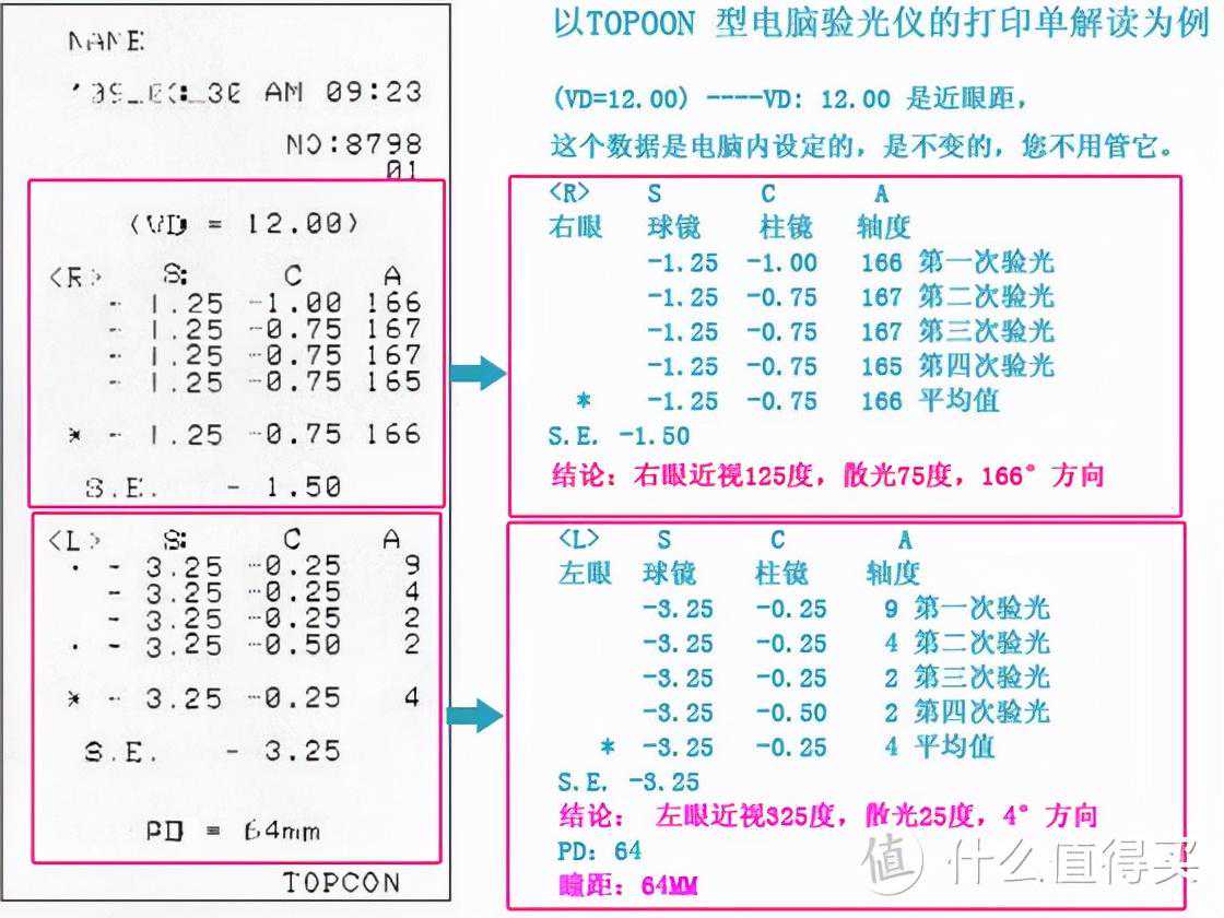 下图是通常机器验光会有的数据,这边给大家详细讲解一下,通过这些数据,可以配到非常准确度数的眼镜镜片了。而且要注意以下,电脑验光会测量多次,验光单上面有多组数据。