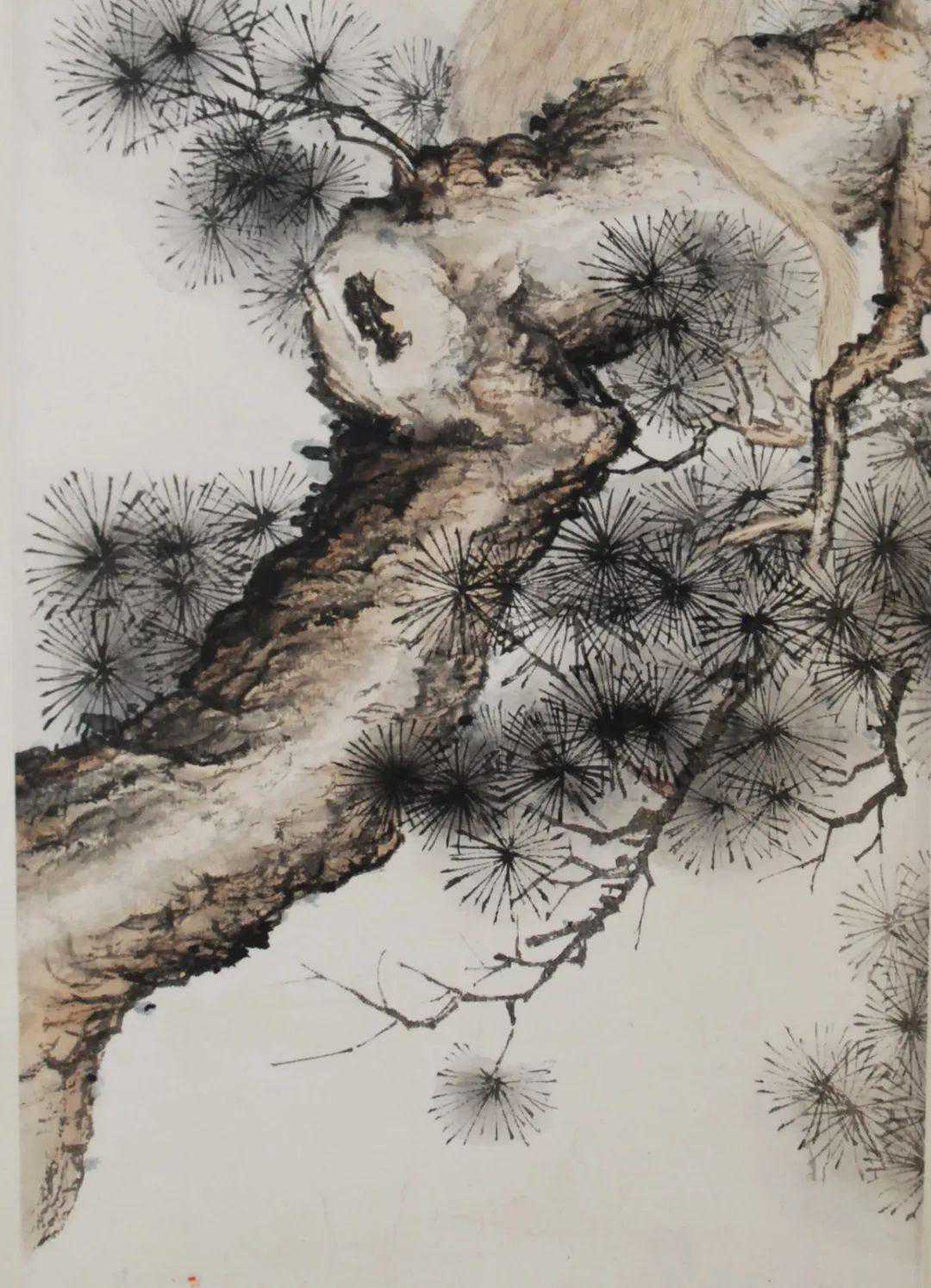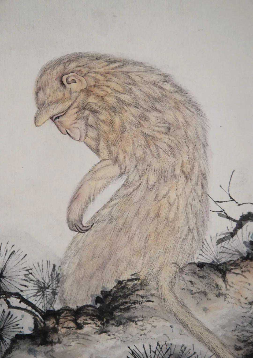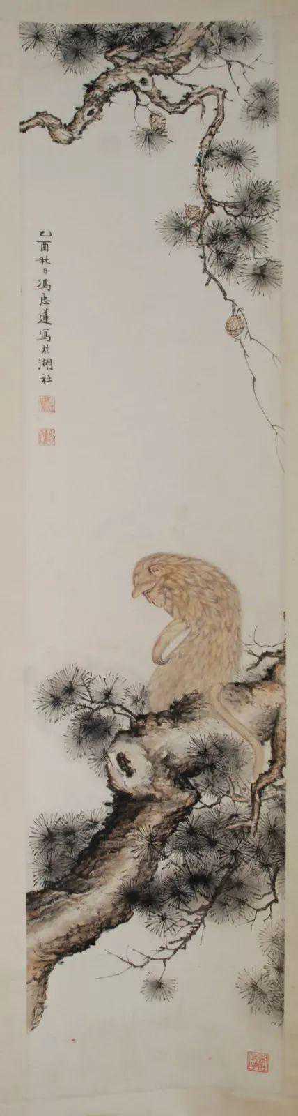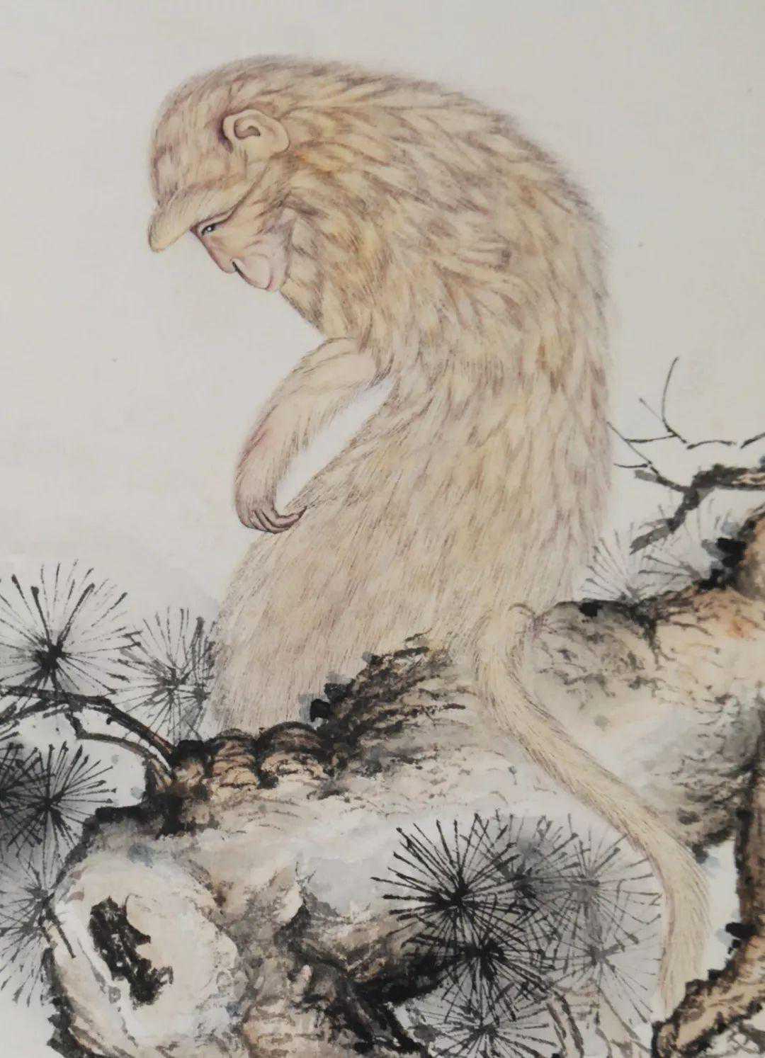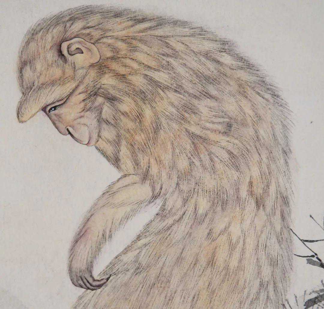 冯忠莲是陈少梅的学生。她的笔下,比陈少梅还要多一份温婉细腻,这件《猿立松间》在猿猴的神态和毛发上处理得十分细腻。猿猴颔首的动态和眼神,以及毛发严整有次序,可以看出是难得的一幅用心之作。