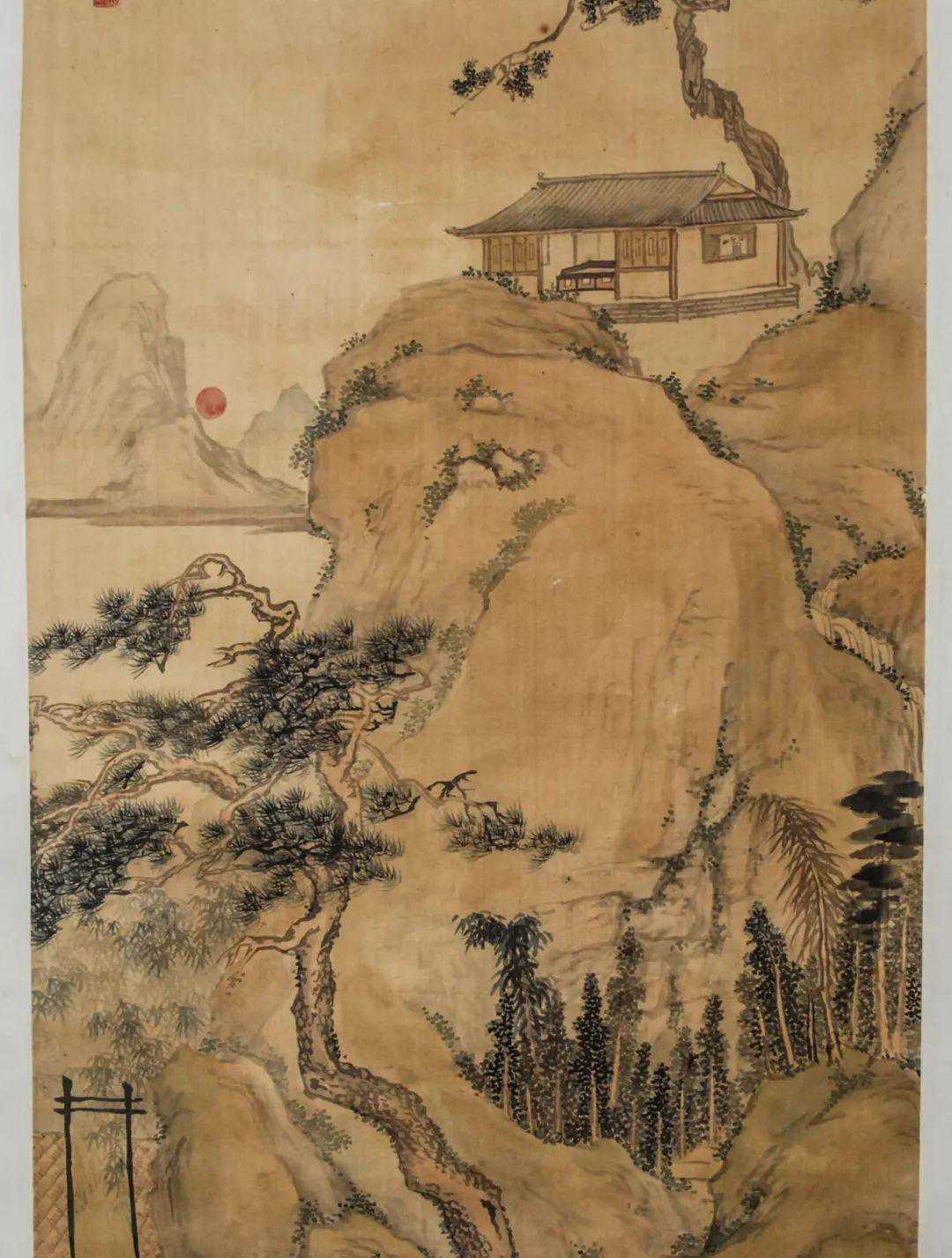 说明:上款”艾卿太傅”即朱益藩(1861-1937),字艾卿,江西莲花人,曾任光绪、宣统两代清帝的老师,故金城尊称其”太傅”。1920年朱氏六十寿辰,京城名流多往庆贺,溥仪亦赏赐重礼,金城此作绘松柏高立、江山红日,以”申九如之祝”。