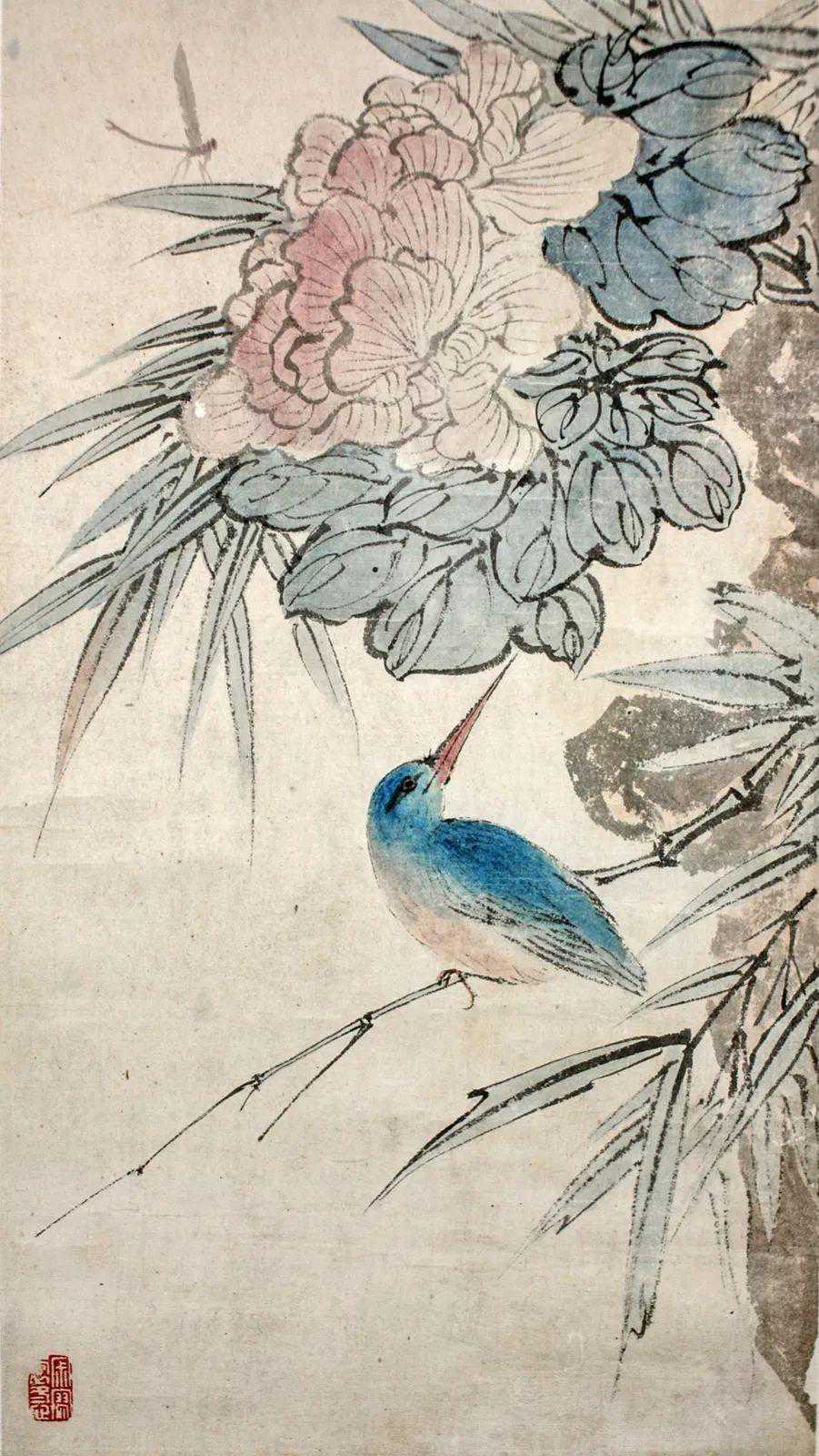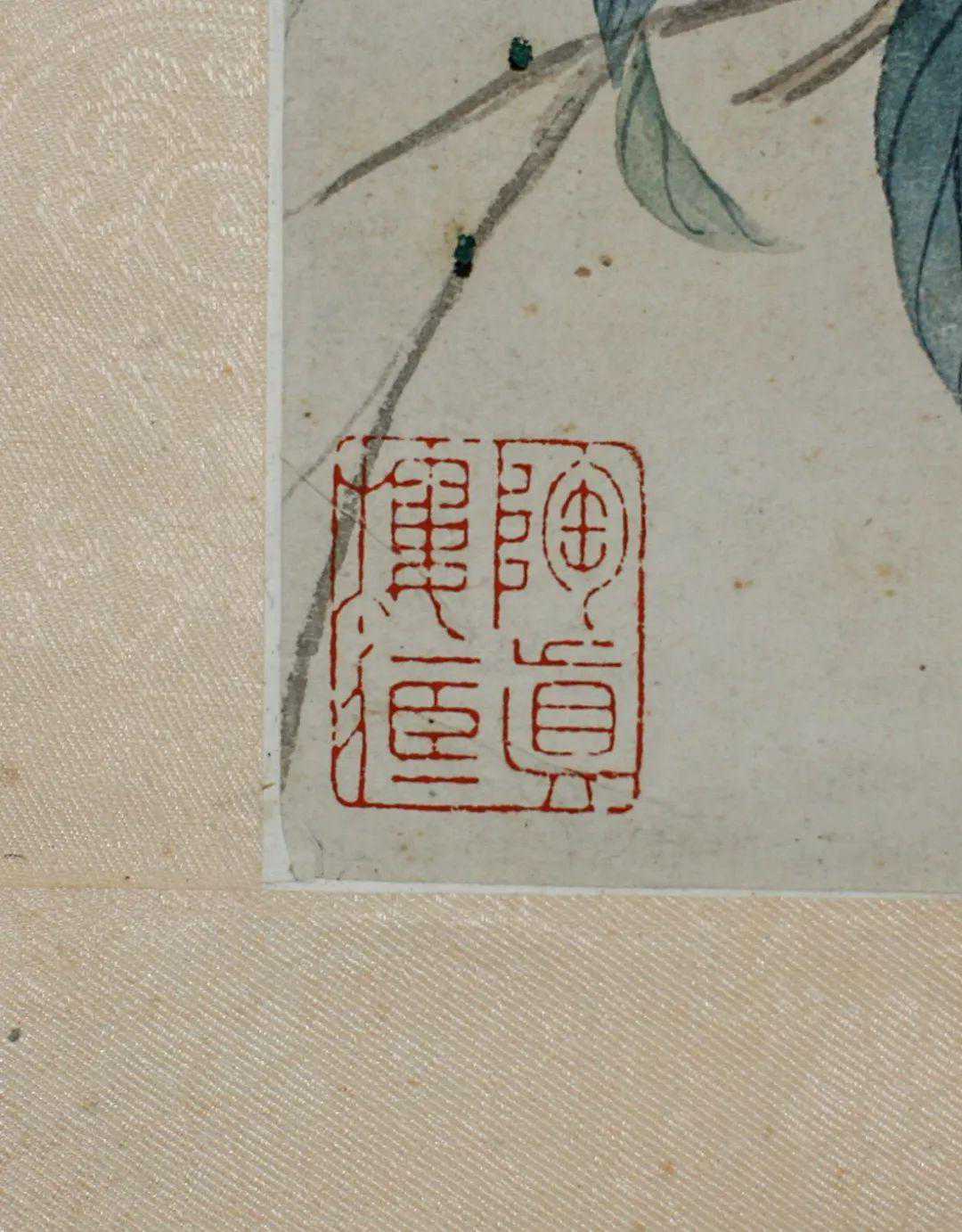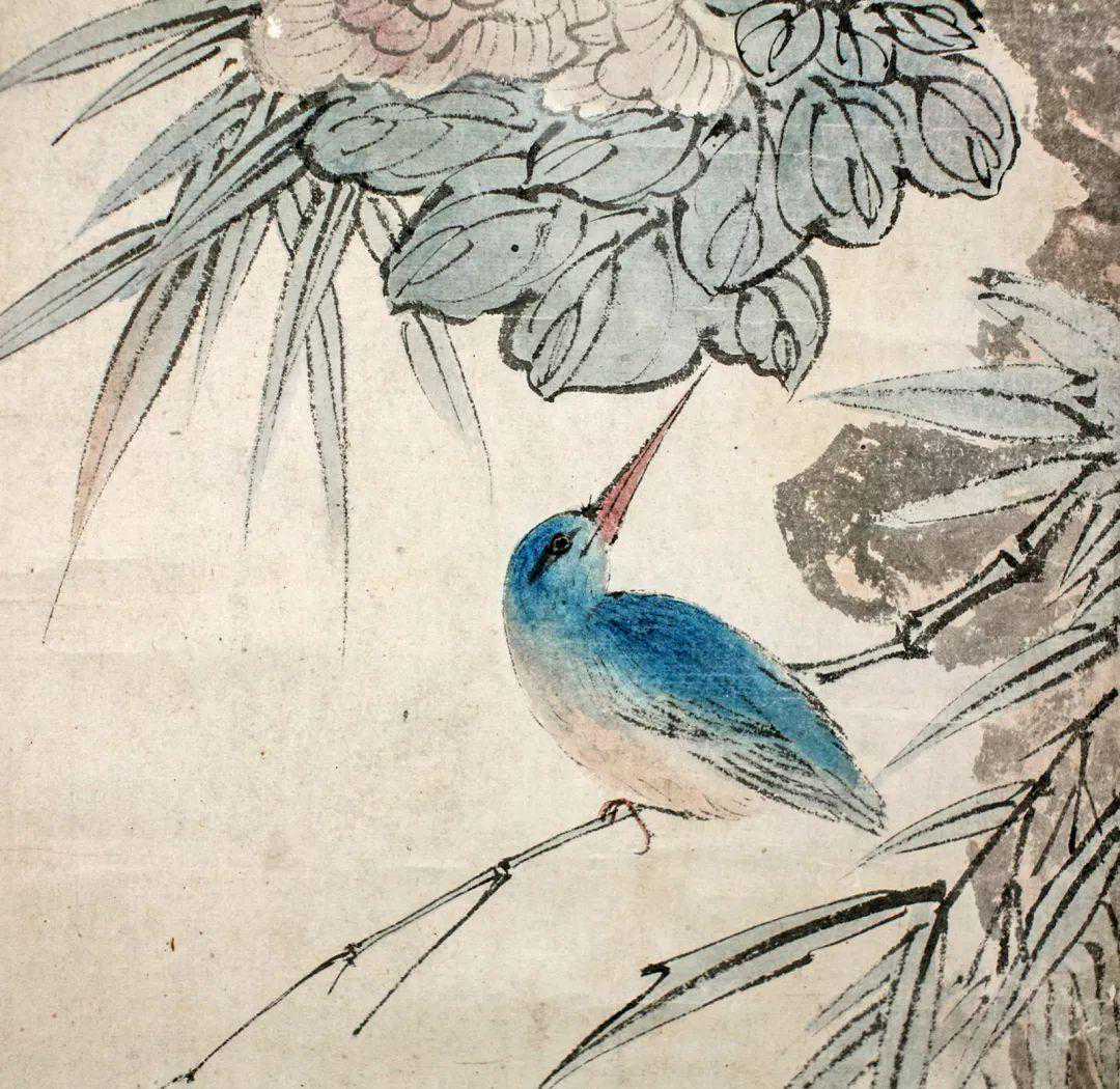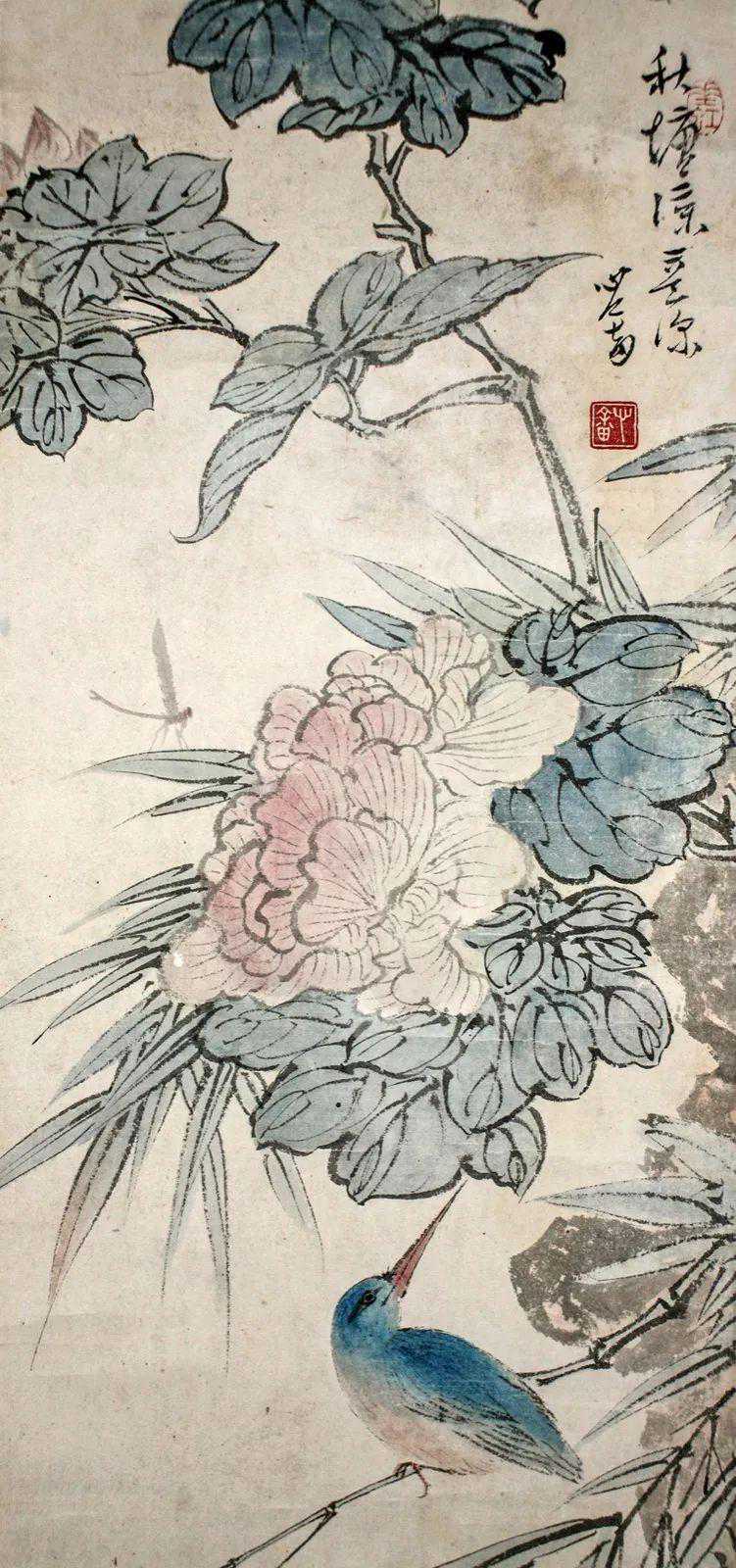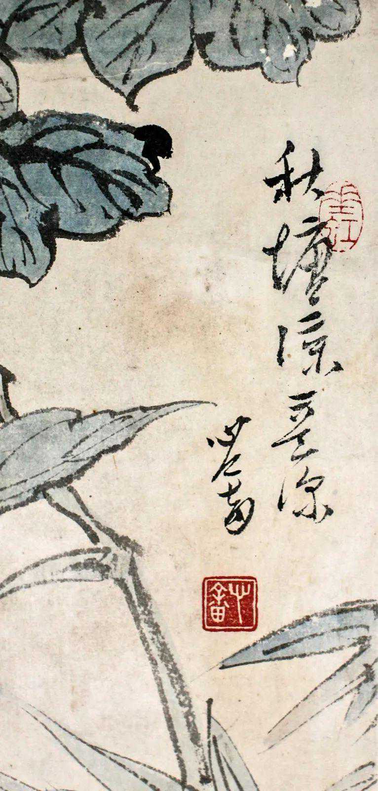 这件《秋塘凉意》画的很有趣,就比如这件《秋塘凉意》中花鸟的位置和款识有一层呼应关系。蓝色的鸟侧头回望,看向花和款识使人们感到很有意思。