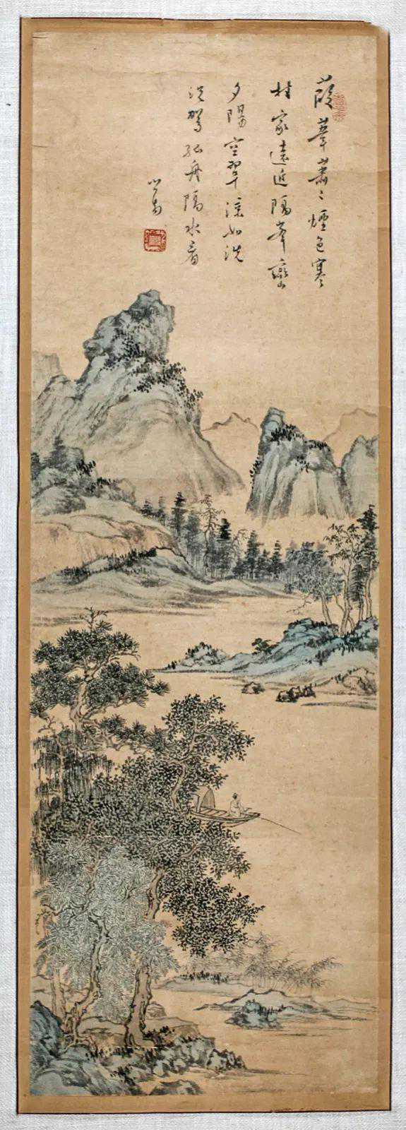 款识:葭苇萧萧烟色寒,村家远近隔峰峦。夕阳空翠凉如洗,从驾孤舟隔水看。心畬。