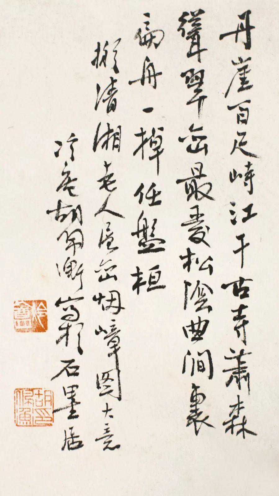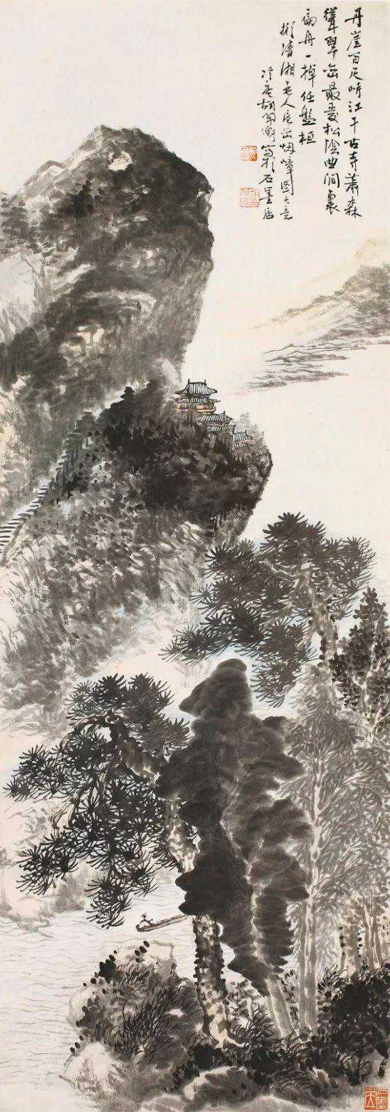 款识:丹崖百尺峙江干,古寺萧森耸翠峦。最爱松阴曲涧里,扁舟一棹任盘桓。拟清湘老人层峦烟嶂图大意。冷庵胡佩衡写于石墨居。