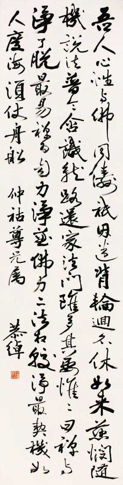 款识:吾人心性,与佛同俦。只因迷背,轮回不休。如来慈悯,随机说法。普令含识,就路还家。法门虽多,其要唯二。曰禅与净,了脱最易。禅唯自力,净兼佛力。二法相校,净最契机。如人度海,须仗舟船。仲祜尊兄属,恭绰。