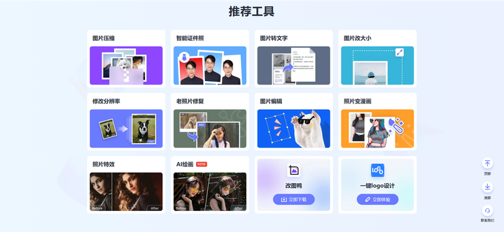 除具备常规的图片压缩、转换、编辑功能以外,还有AI绘画、抠图换背景、智能证件照、老照片修复、照片变漫画等特色功能。