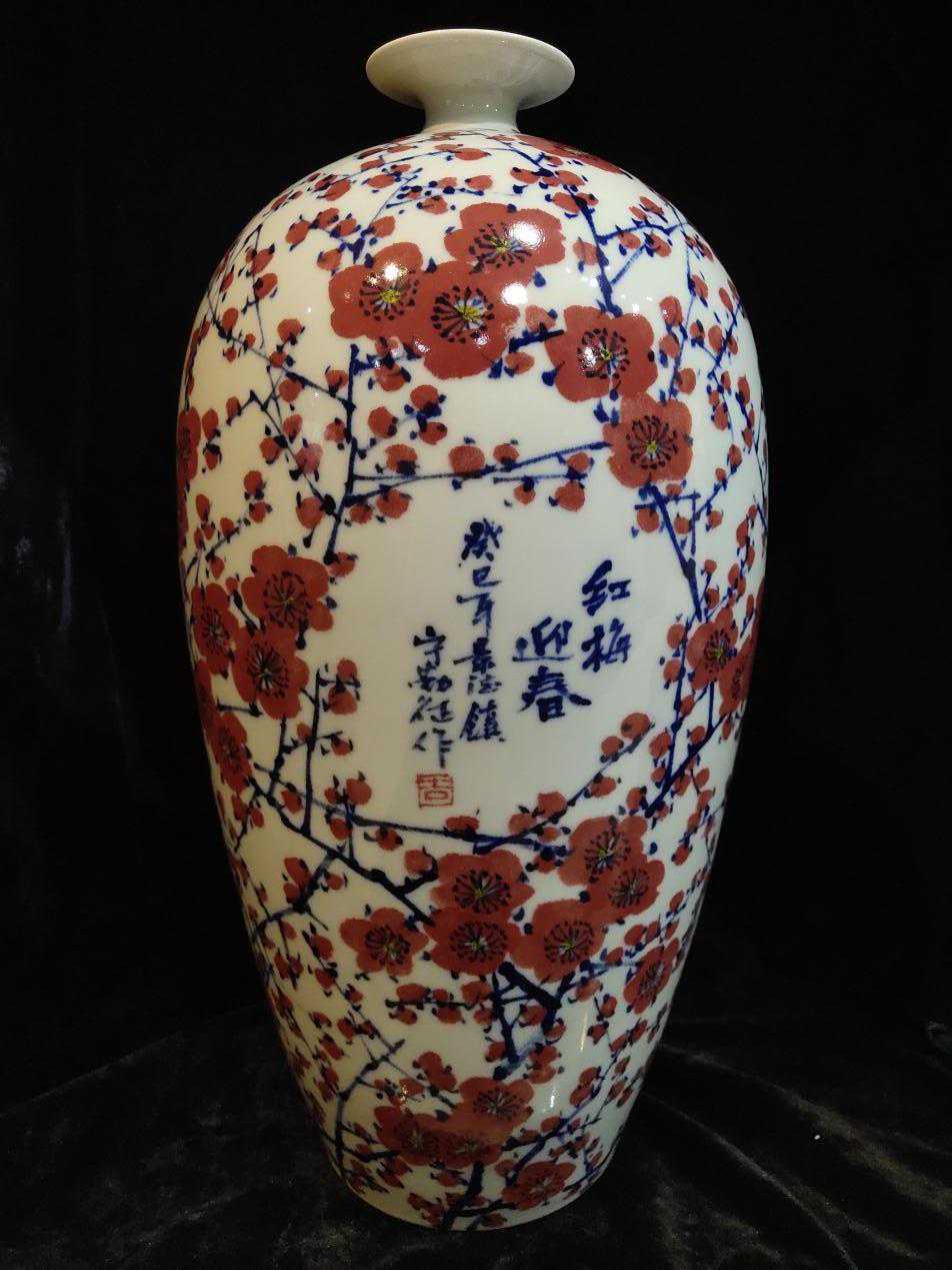 “白梅懒赋赋红梅,逞艳先迎醉眼开。”曹雪芹这首诗把红楼写成了梦,而中华红的梅花把“逞艳”发挥得更加淋漓尽致,让迎春的味道更加的浓烈,这就是中华红独有的魅力。梅花剪裁、构图新巧,看似错综复杂的梅花零零落落,却让瓷器本身从每个角度看都意境饱满。所绘梅枝刚劲曲折,又有力度,苍劲有力的树干,显得“瘦硬如屈铁”,爽朗而有力。所有元素的完美结合,绘出了满瓶的“梅魂”,让人赞叹不已。