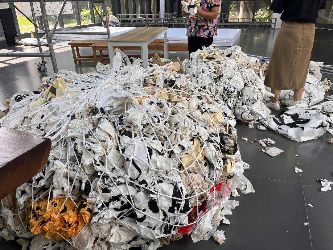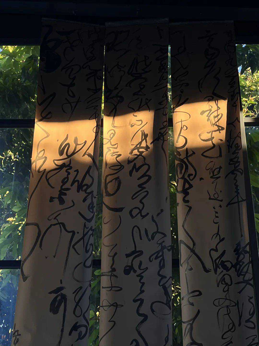 展览现场用书法家平时创作的废纸作为展览的主题装置,高高的悬挂在展览现场。这样也就把观众引入到策展者想要表达的意图,即一个书法家的创新与探索不只是口号,而是通过日复一日的练习,没有废纸三千的积累,不会有真正的成果。这次装置即是宣扬成果也在传递一个信息:一个文化工作者的破境或重拾没有捷径。