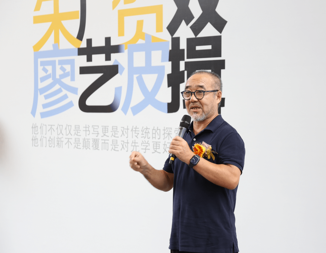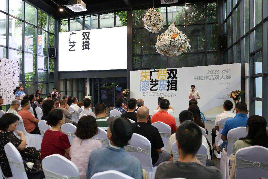 彭建生代表顺德书协对展览的举行表示热烈祝贺,他表示很荣幸参加朱广贺、廖艺波书画作品联展,非常开心与各位嘉宾艺友相聚顺德黄连,一起来见证两位老师的展览盛况。他代表顺德区书法家协会对朱广贺廖艺波两位艺友的联展表示祝贺,他说:在迎接展览开幕之前,我已经认真看了展览的链接,而刚才我也认真浏览了现场原作,可以说很震撼,很精彩!看到了两位老师的精神追求与艺术探索成果,我感觉两位老师的书写风格很搭,不违和,这应该算是双人展的成功案例,值得借鉴和推广。朱广贺老师生活、从艺在佛山,书画印早已被同行所称道,今天展览的作品确实值得一看再看,细品慢品。而艺波兄是我熟悉的朋友,他喜欢写大草,每每酒后催发能量,激发性情,铺纸引墨,挥写胸中之快,如此,真性情的艺术实践,有多少人懂我不知,但我懂,他展示的许多作品都很精彩,品读起来很享受,当然估计有更多的习作成了废品,如现场我们头顶上的装置,所以朱广贺廖艺波两位都是探索型的艺术家,作为从艺者,我们应该为他们的探索实践精神而鼓掌,当然,祝贺两位老师展览成功,艺术水平猛进。