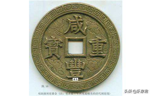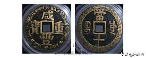 附图5:鎏金乾封泉宝钱背刻莲瓣纹,(注:此2枚钱引用自《唐五代十国钱币鉴赏与辨伪》一书,非笔者藏品。)