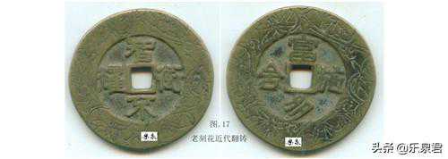 第16-17二枚为近代人利用刻花钱翻铸的钱币。图14-17钱与前述8枚刻花钱对比,仔细观察刻线部位,不同之处是有流铜现象,部分线条断断续续不清晰,线端或线边较钝,锋利感不强。