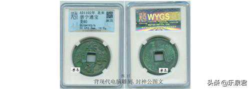 附图27是一枚崇宁通宝到代真币,被奸商在钱体背面地张处用电脑雕刻机刻上人物神兽及封神公三字,再在线条上涂以伪锈,经过鉴定当真品入盒,是一枚欺骗性及杀伤力较大的伪造币,可用放大镜仔细观察,刻线沟平缓,无刻刀刻出的V形状及刻线末端的出锋。