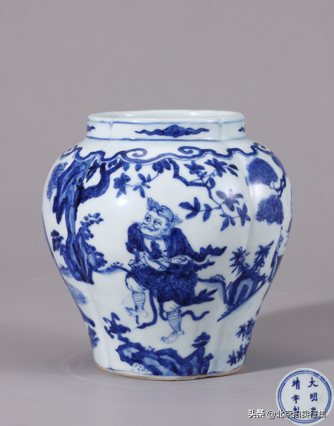 明嘉靖青花“四仙拱寿”图瓜棱罐