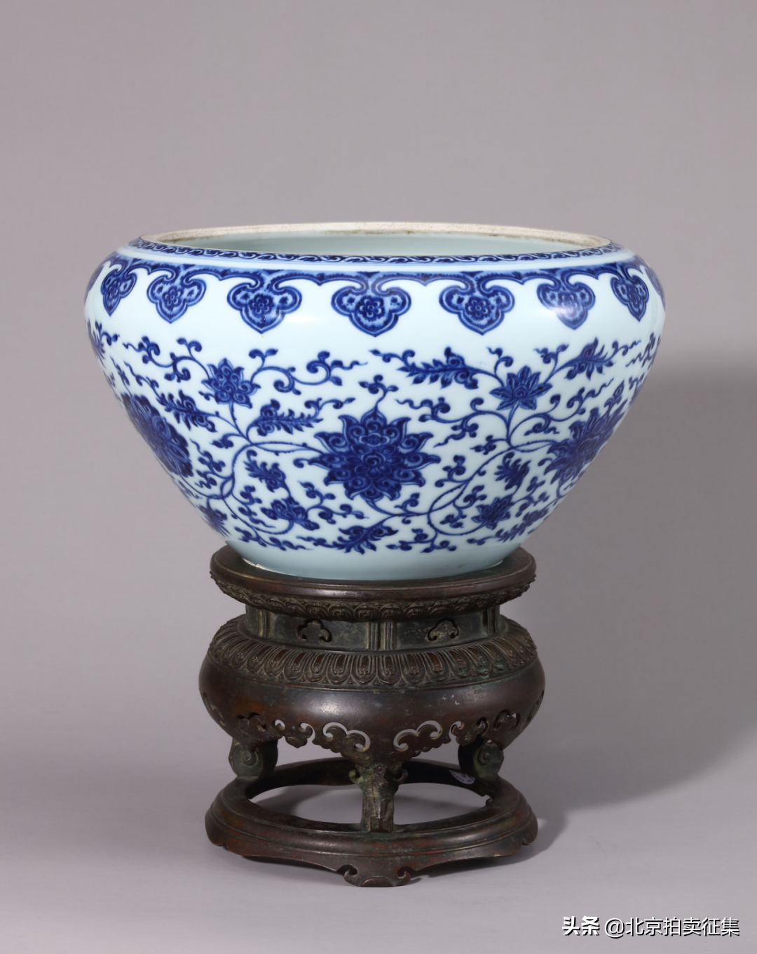 清乾隆仿宣窑青花缠枝花卉纹大钵连铜座