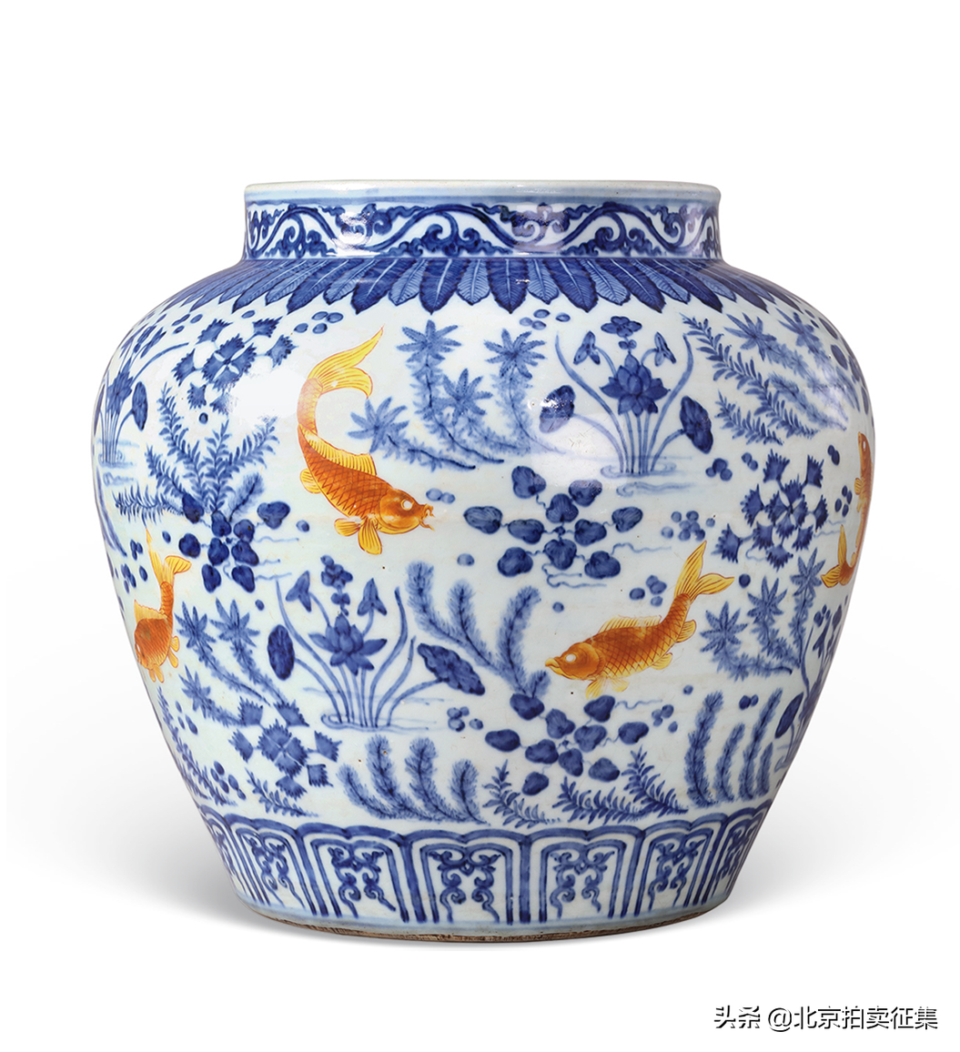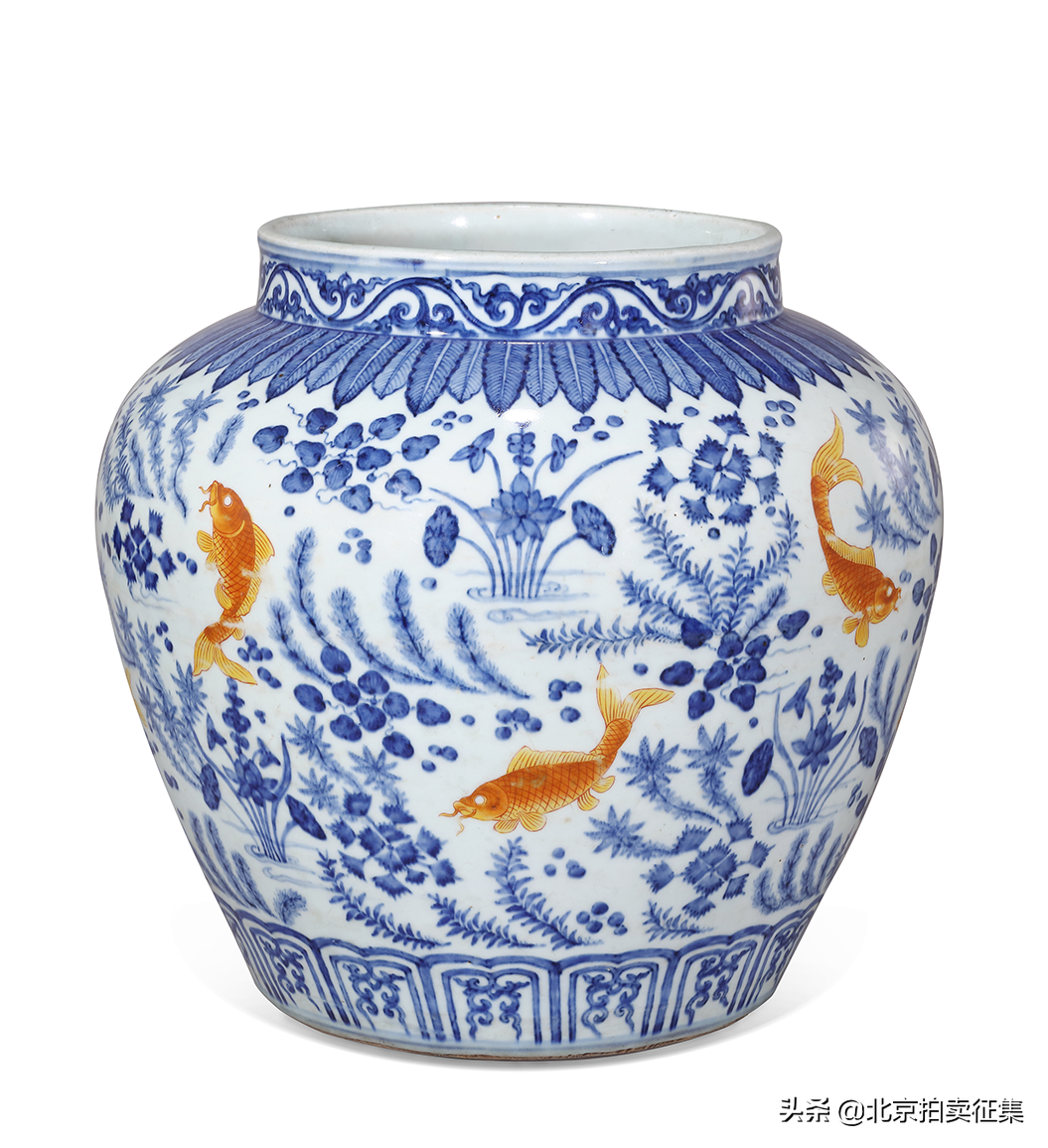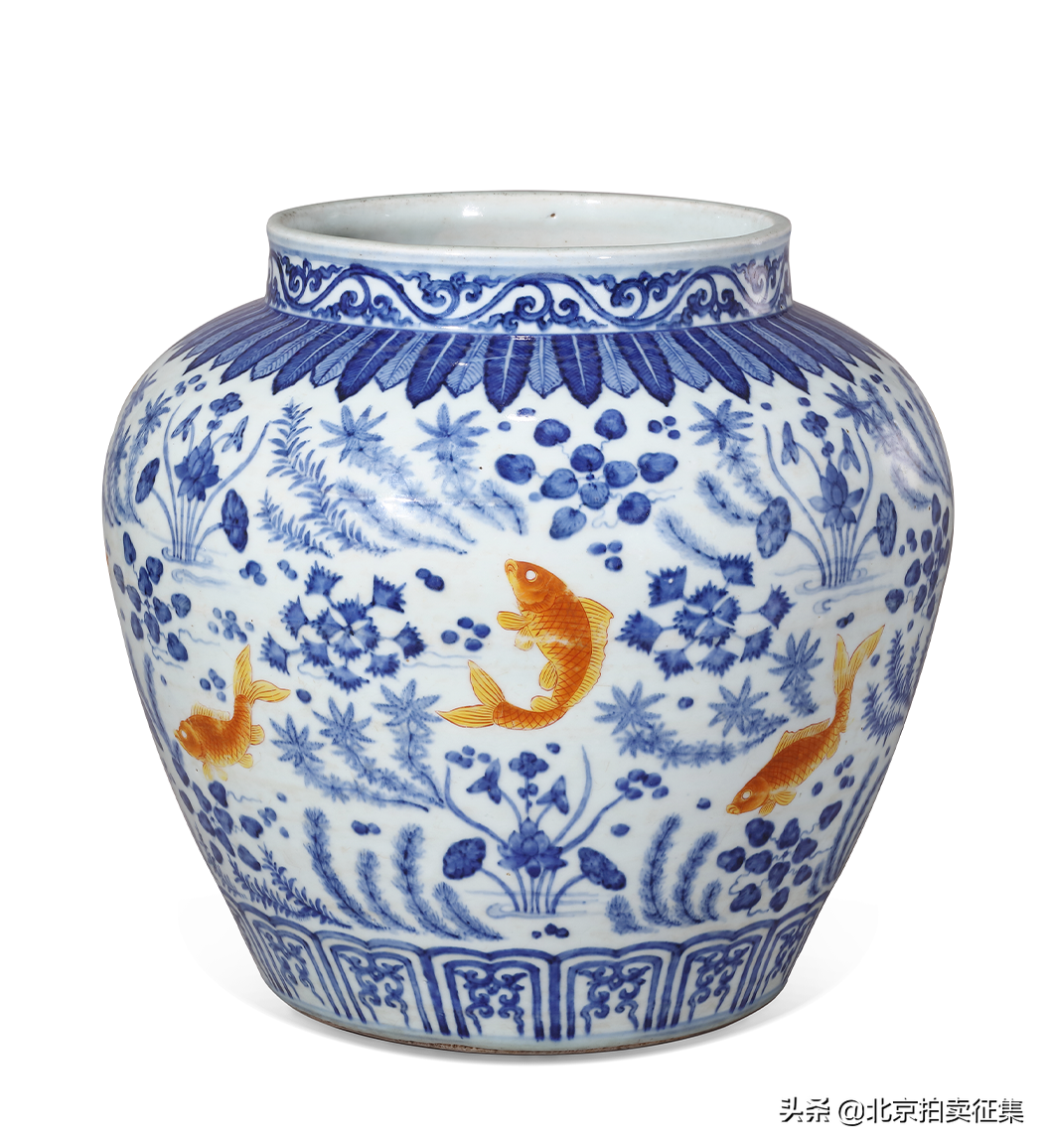 明嘉靖青花矾红加黄彩青白礼贵鱼藻纹大罐