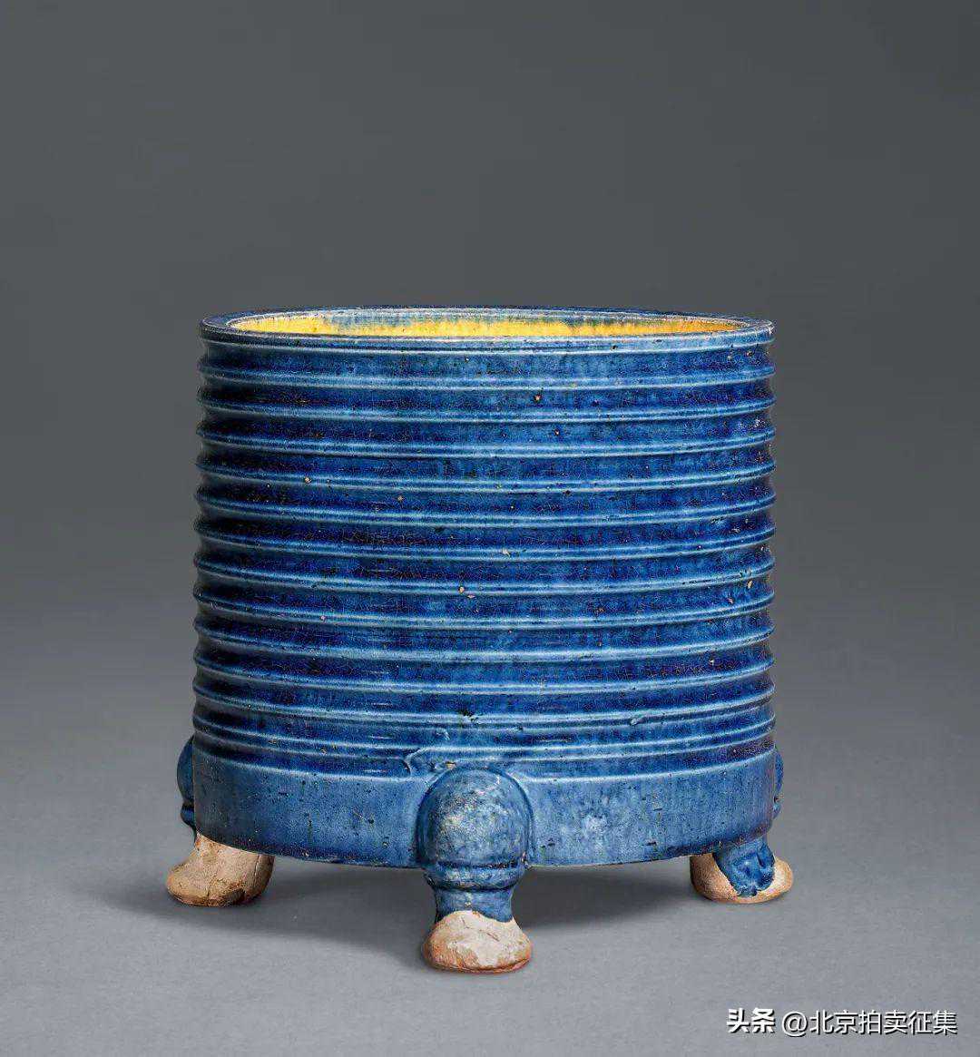 唐蓝釉弦纹三足罐