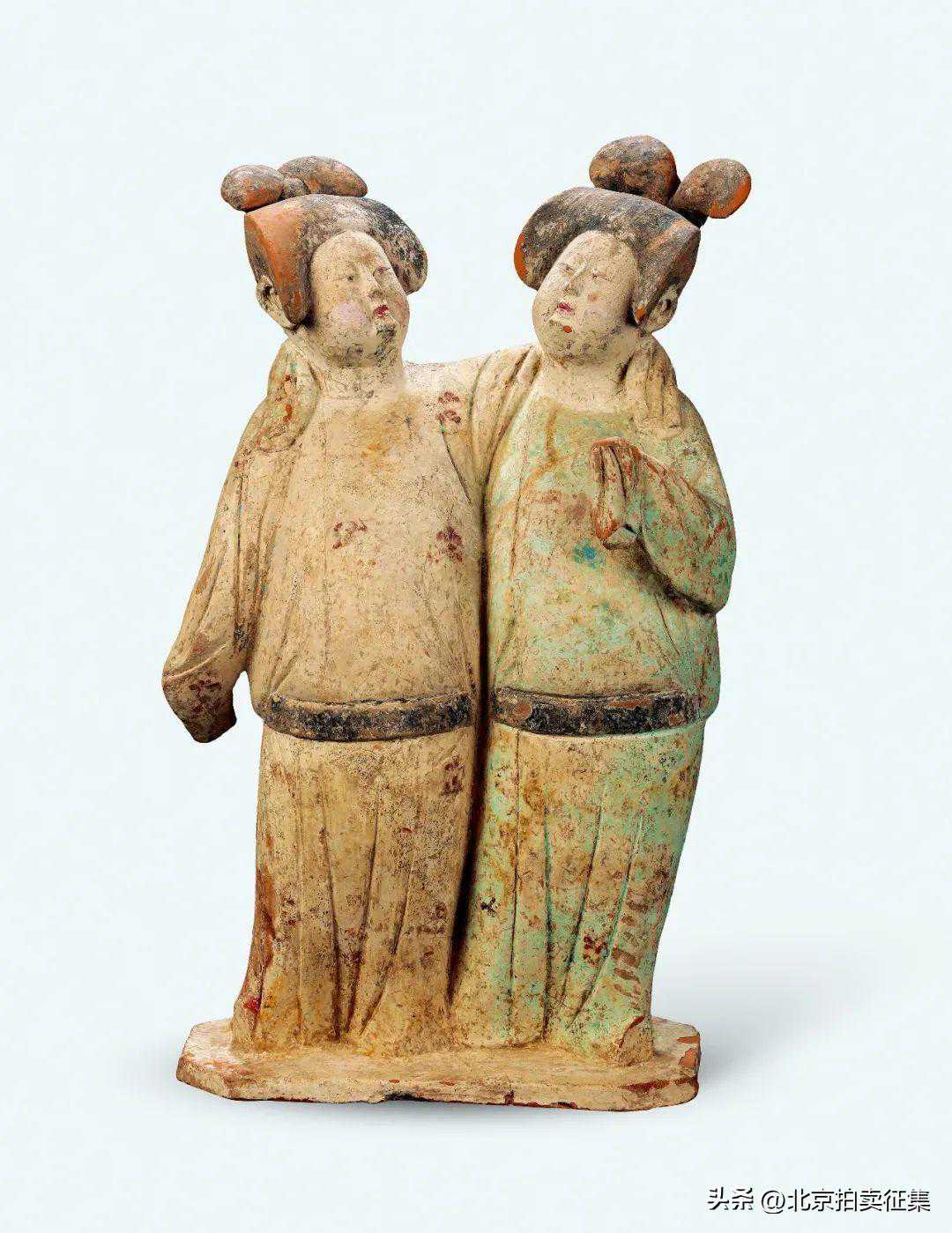 唐彩绘连体侍女陶俑