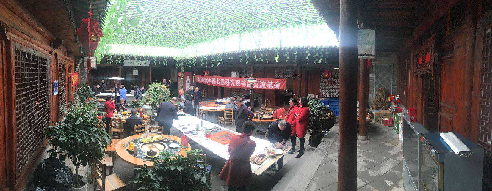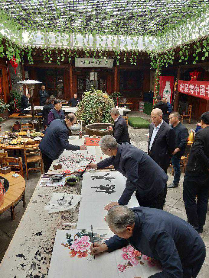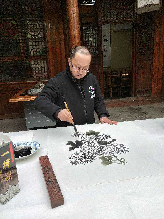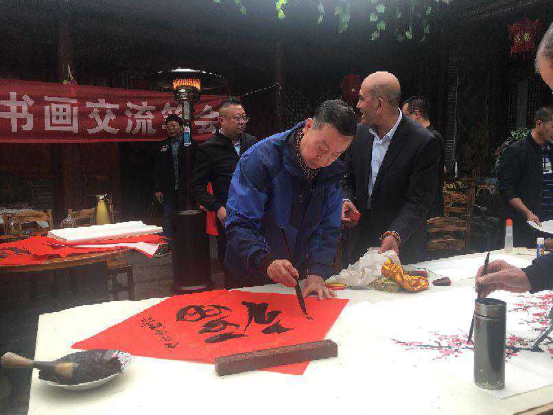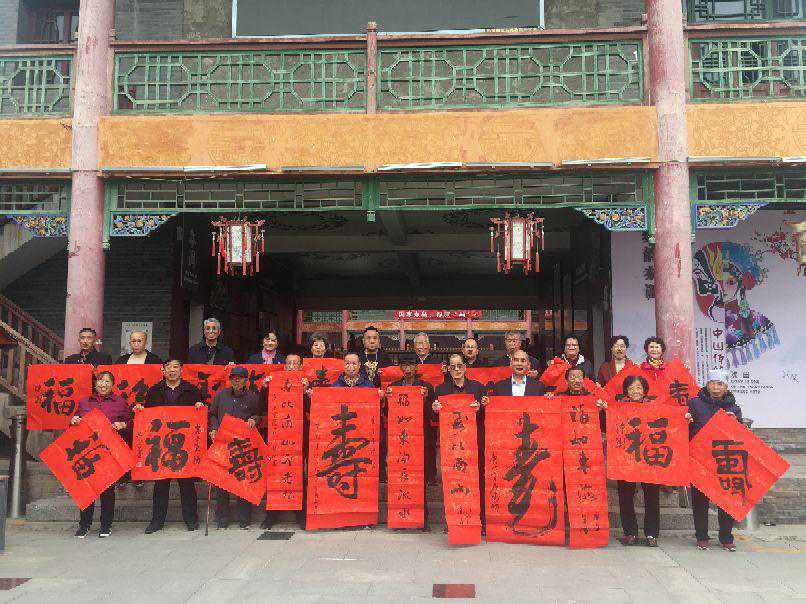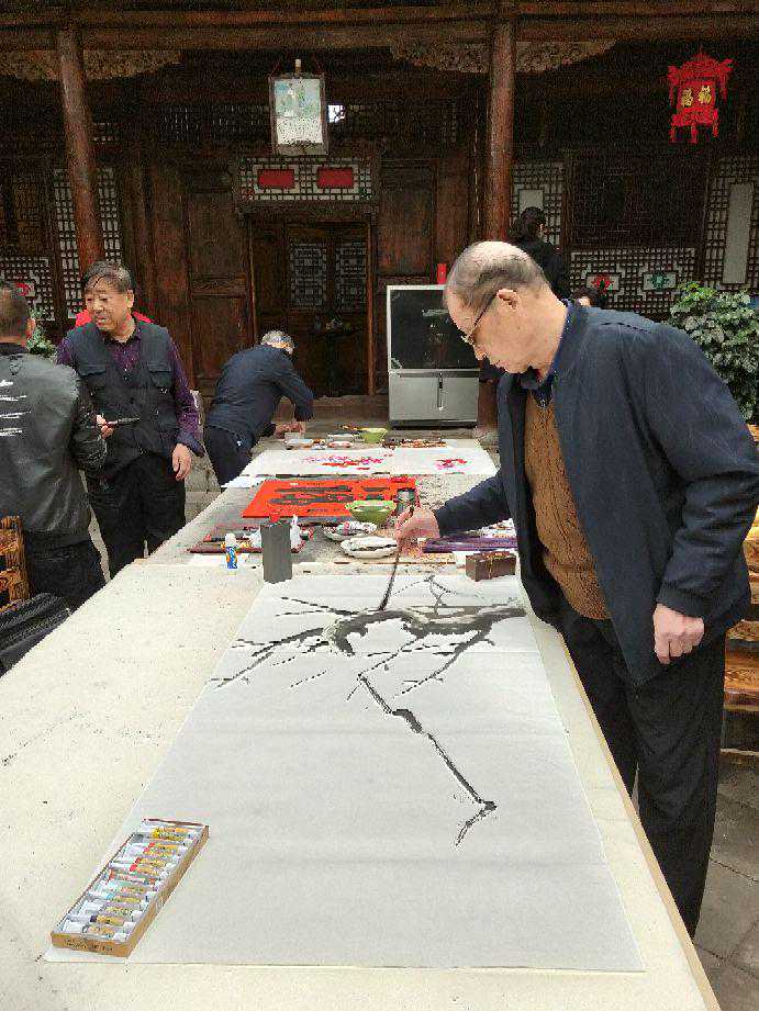 当日活动中,在河口古镇景区老院子农家乐里,送福送寿现场人头攒动,非常热闹。二十几名书画家齐动手,有的写福字,有的画桃子,画山水、牡丹等,在古色古香的宅院里挥毫书写,激情创作。