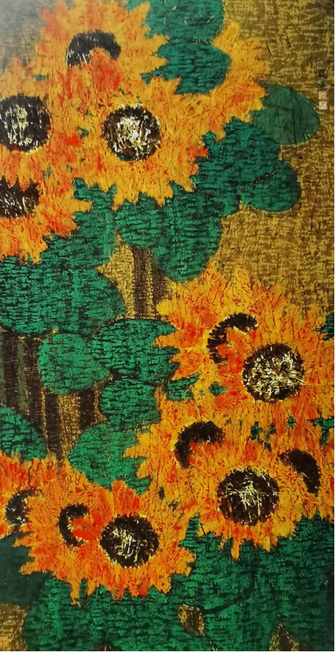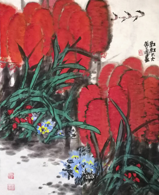角振通还尝试着用不同材料来创作绘画作品,比如说用丙烯来着色,来体现国画技法中所达不到的效果,这种突破在他的很多作品中都有所体现,如《雪白血红》、《黑土地》、《向日葵》等。角振通说,中国画体现的是一种意境,用墨来体现出作者的心情和一些理念,它和西方画的色彩和追求三维立体的理念有所不同。我也是在努力的寻找着中西方绘画的联系,游走在中西艺术之间。