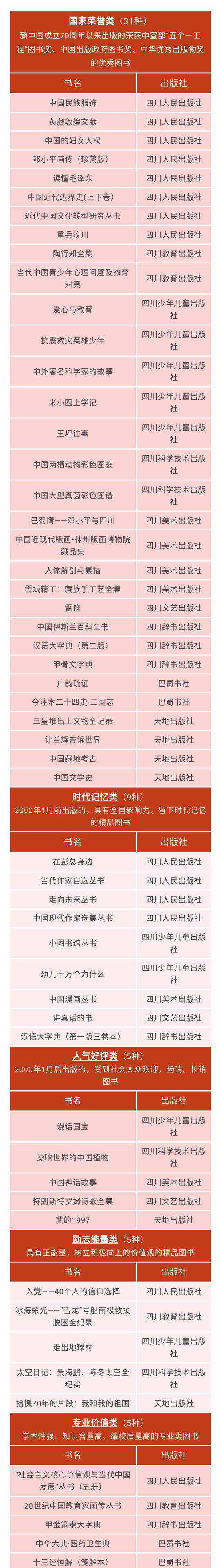 55本好书共分为五类,其中“国家荣誉类”31种、“时代记忆类”9种、“人气好评类”5种、“励志能量类”5种、“专业价值类”5种。其中“国家荣誉类”好书聚焦新中国成立70周年以来出版的荣获中宣部“五个一工程”图书奖、中国出版政府图书奖、中华优秀出版物奖的优秀图书。《读懂毛泽东》《陶行知全集》《雷锋》《米小圈上学记》《雪域精工:藏族手工艺全集》《中国伊斯兰百科全书》《今注本二十四史·三国志》《让兰辉告诉世界》等31种摘获国家级大奖的川版图书全聚一堂。